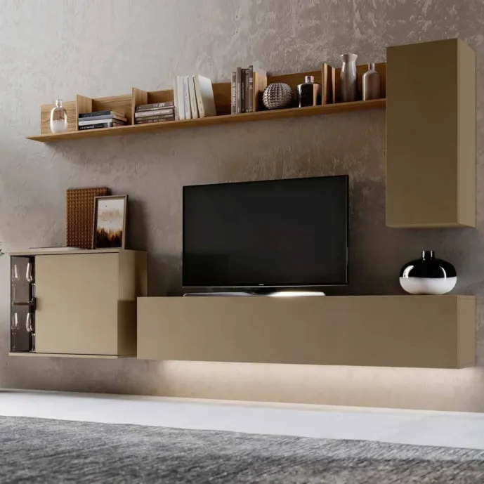 La parete è composta da elementi modulari che possono essere combinati in base alle proprie esigenze. Questo permette di creare una composizione personalizzata e adatta a qualsiasi spazio.