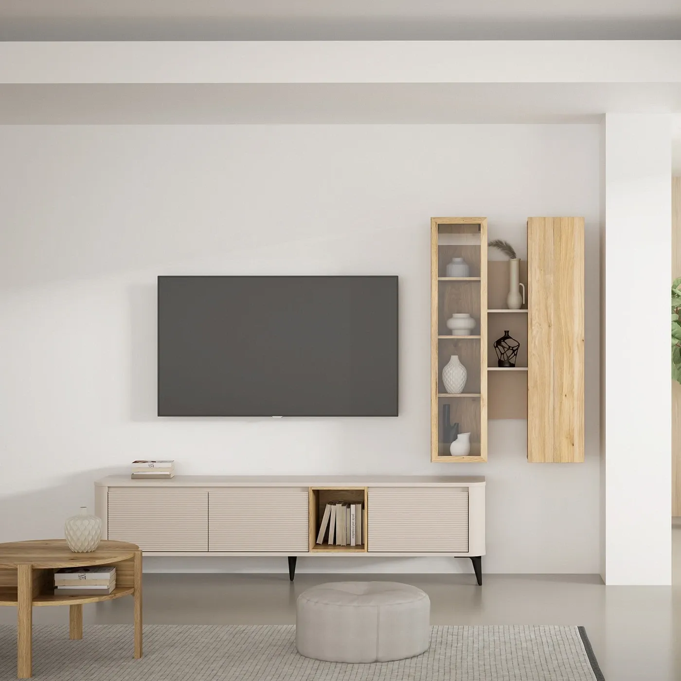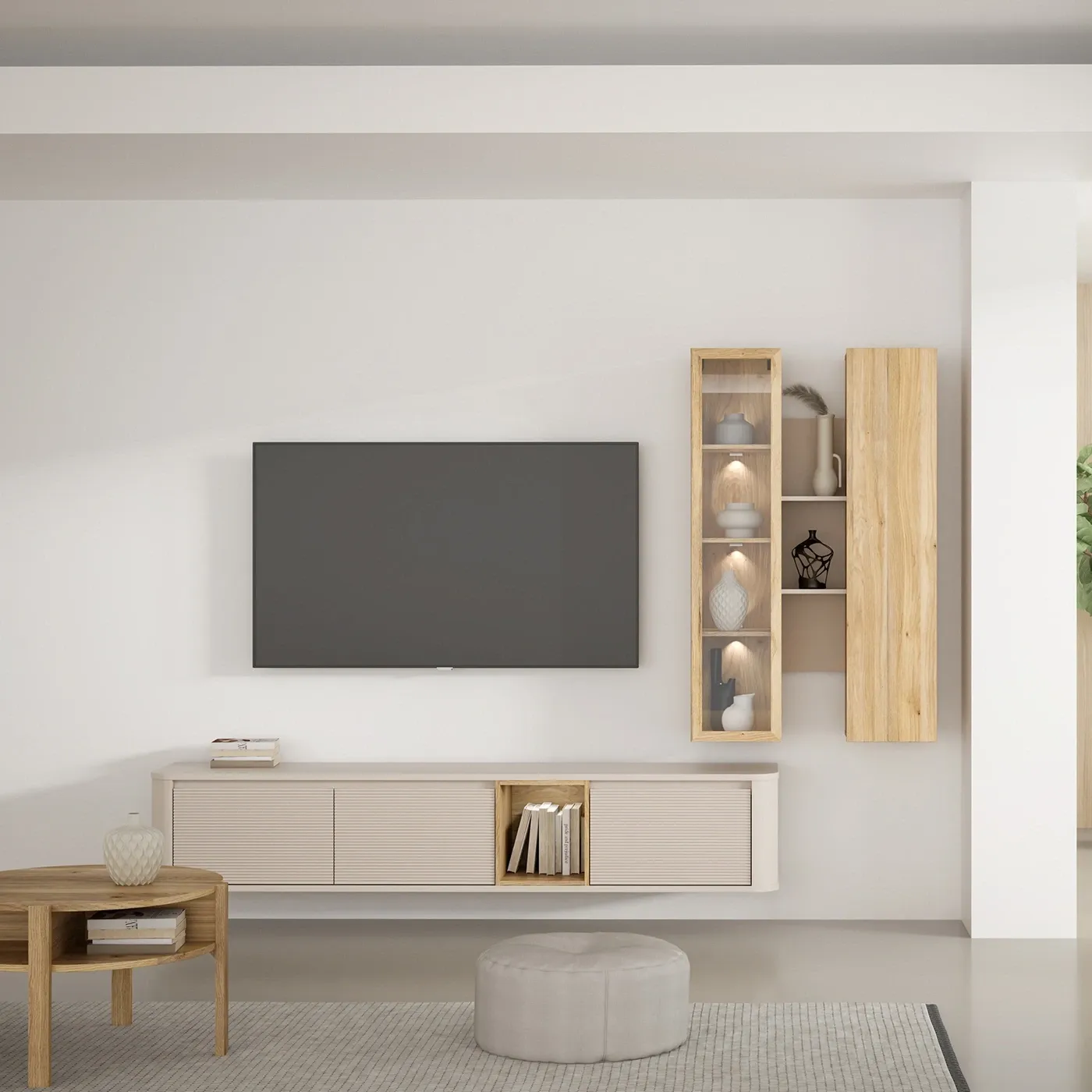 La madia si distingue per l'estetica dei suoi frontali caratterizzati da un effetto millerighe, mentre un'altra articolarità insolita è la possibilità di montare il porta tv in 3 modi diversi:
