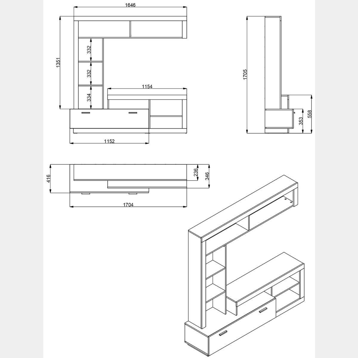 La parete attrezzata si sviluppa con una base dotata di una ribalta circondata da un elemento che crea tre vani a giorno, una libreria verticale composta da tre ripiani a cui è collegato un componibile orizzontale provvisto di divisiorio centrale.
