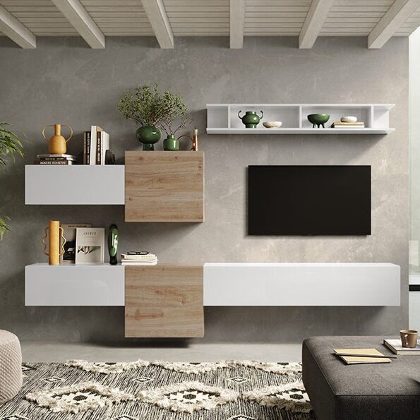 Parete sospesa composta da una ribalta, una libreria, un cubo ed una ribalta piccola, finitura Bianco lucido e Cadiz. Aggiungi altri elementi al tuo soggiorno oppure vedi tutta la collezione Logica.