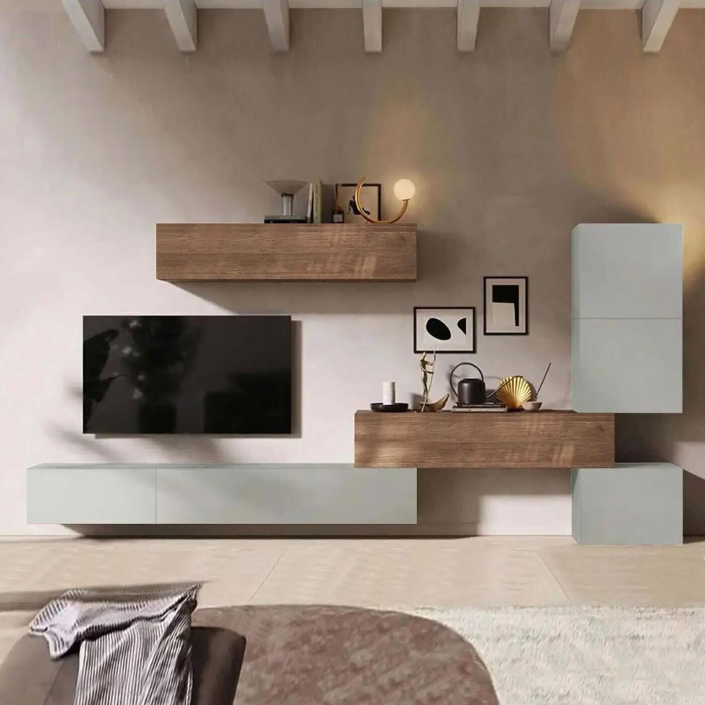 La parete attrezzata è un esempio di design modulare e altamente personalizzabile. La sua forza sta nella flessibilità compositiva e nella capacità di creare un arredo che sembra quasi un'installazione artistica.