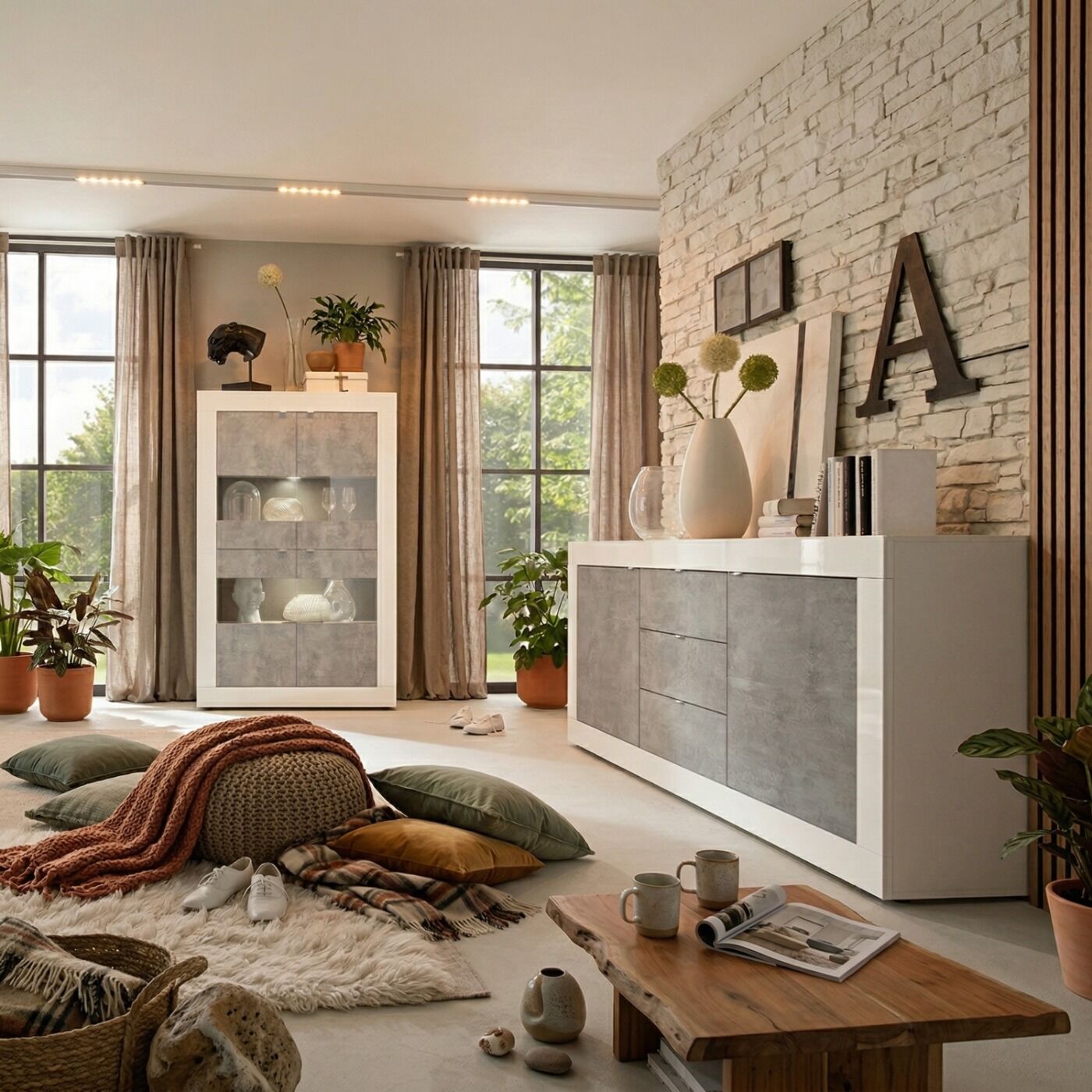 Vetrina a 4 ante, Cemento e bianca lucida, prodotto Made in Italy. 4 ampie ante in finitura Cemento, parzialmente a vetro, con ripiano interno rendono questo articolo indispensabile per mettere in mostra le vostre collezioni.Misure: Vetrina L.102 H.162 P.43Credenza a 2 ante e 3 cassetti, Cemento e bianca lucida, prodotto Made in Italy. 2 ampie ante con ripiano interno e 3 cassetti centrali rendono questo articolo versatie.Misure: Madia L.210 H.86 P.43Tavolo moderno e di design, disponibile fisso in due dimensioni, o con allunga, in finitura bianco lucido laccato, le gambe e il piano sono lavorate con geometriche forme per creare un movimento sinuoso.Disponibile nelle dimensioni:- L.137 H.78 P.90 CON ALLUNGA GIA' COMPRESA - PRONTA CONSEGNA- L.180 H.78 P.90 CON ALLUNGA OPTIONAL - 15 giorni lavorativi
