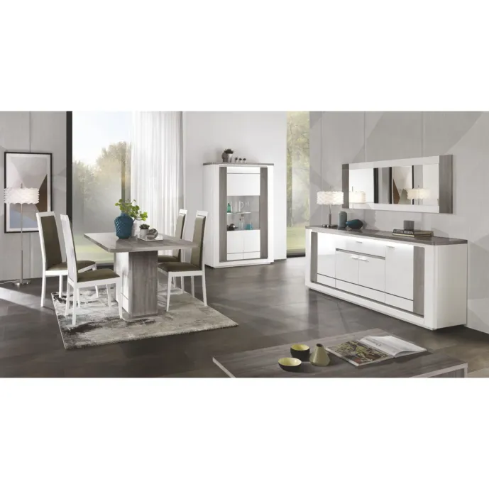 Soggiorno in finitura Rovere adamello e Bianco laccato lucido composto da una vetrina con due ante, da un tavolo, da uno specchio, da una madia.