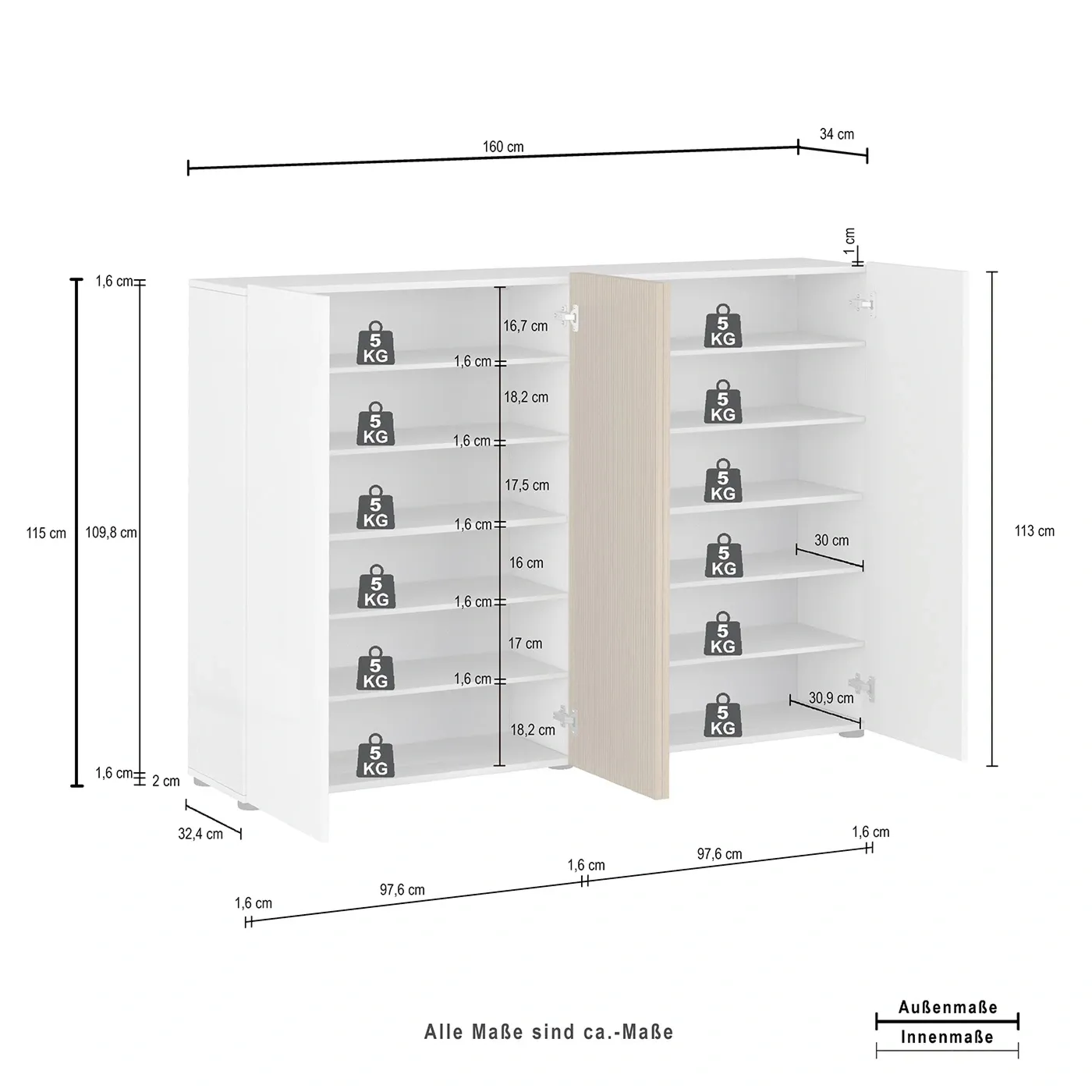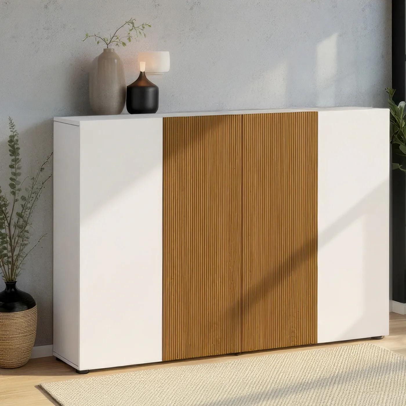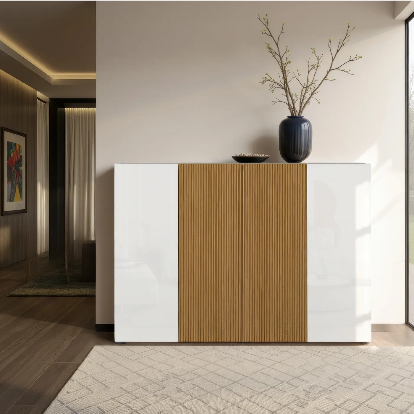 Scarpiera a 4 ante, L.160 H.115 P.34, Bianco e Rovere cannettato