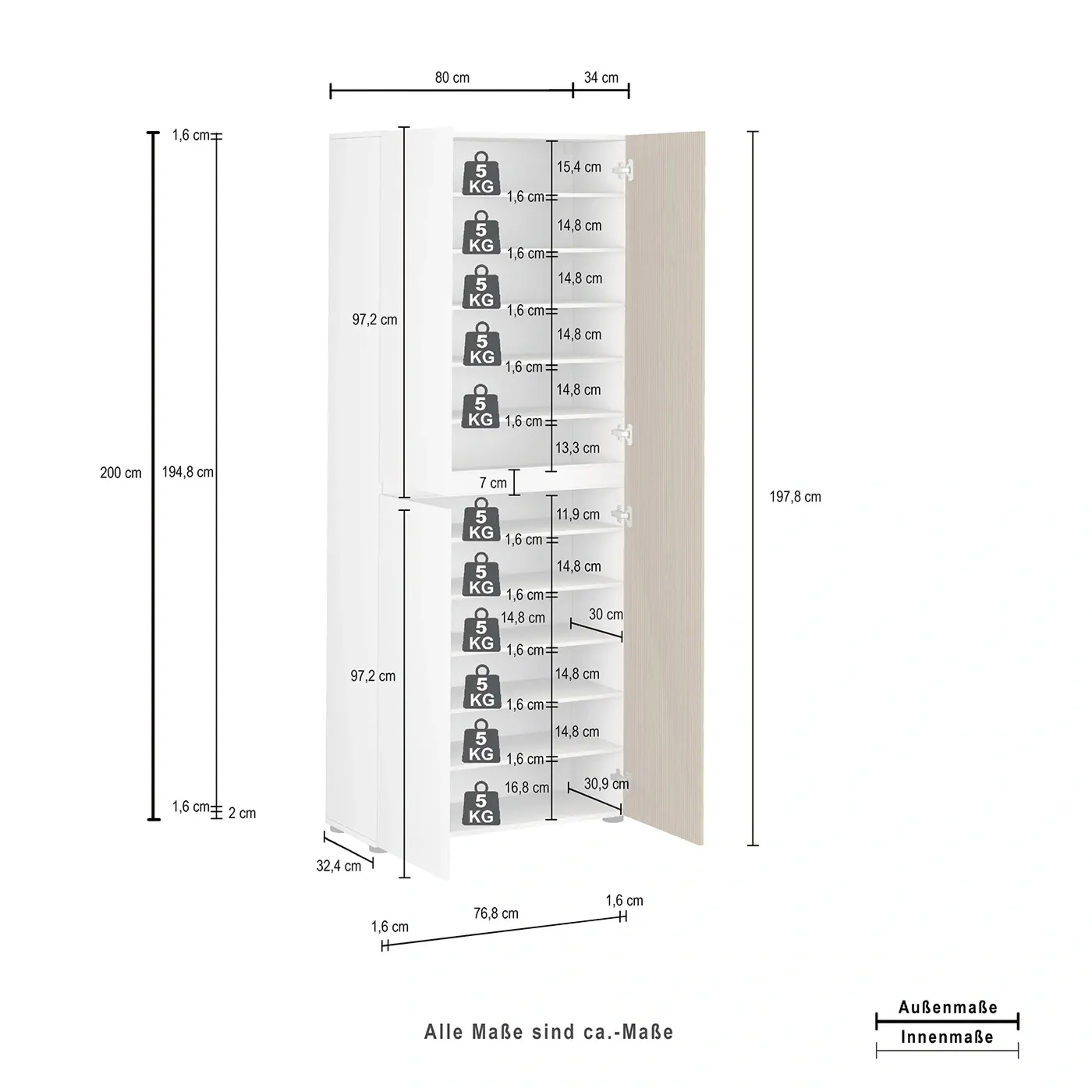 Scarpiera alta e larga a 4 ante battenti capace di contenere molteplici paia di scarpe grazie ai suoi 10 ampi ripiani. Ideale anche per conservarvi altri oggetti oltre alle scarpe.