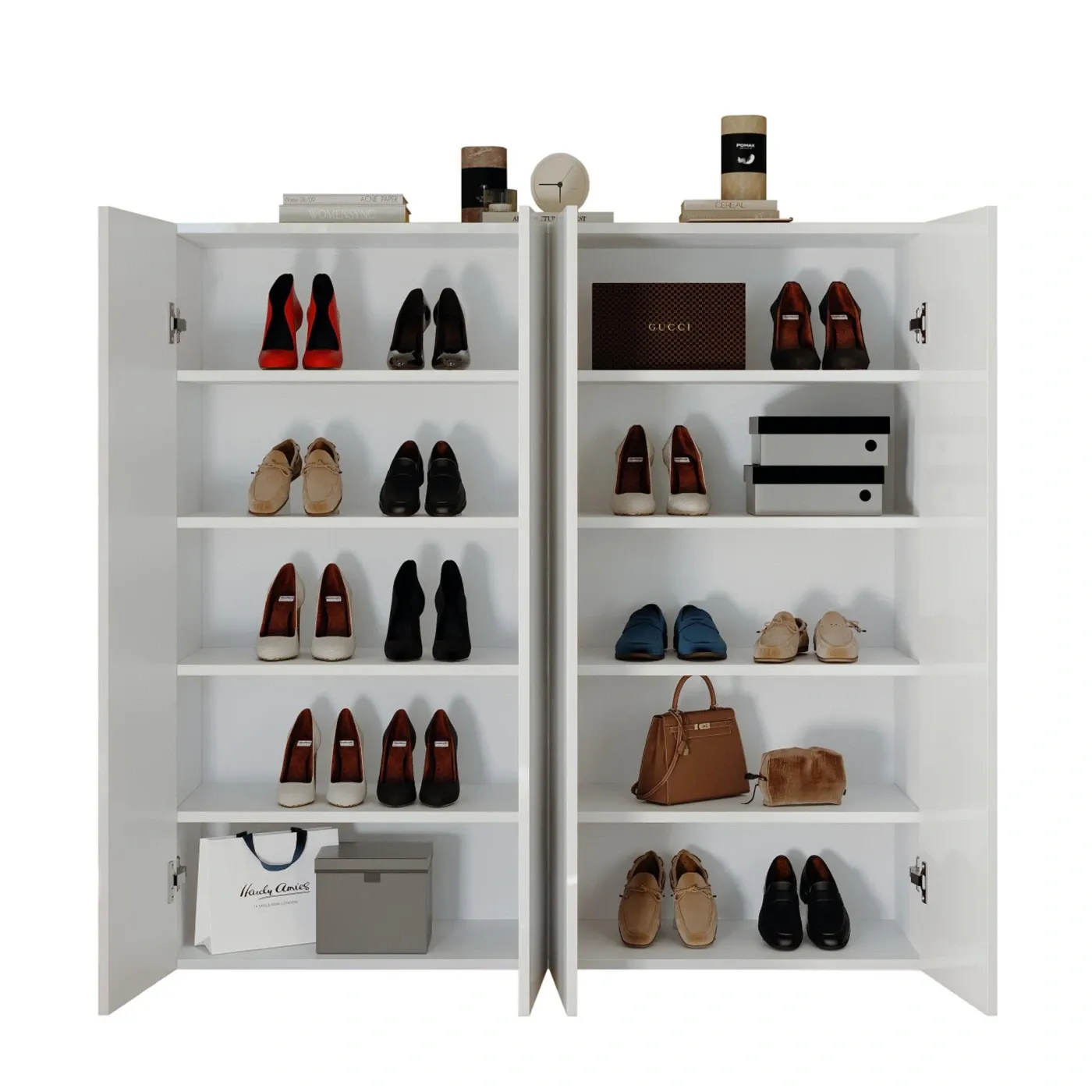 L'articolo possiede 4 ante e nasconde dietro di esse 8 ripiani che offrono molto spazio per contenere svariati piani di scarpe. L'ampio piano d'appoggio consente anche di posarvi oggetti o soprammobili da esposizione e/o di design.