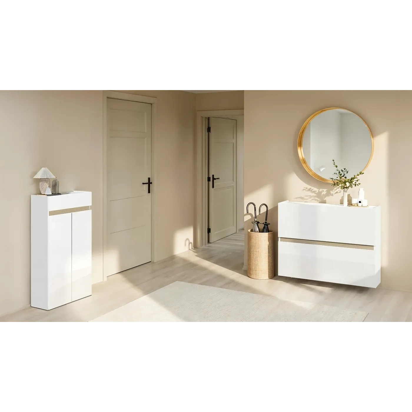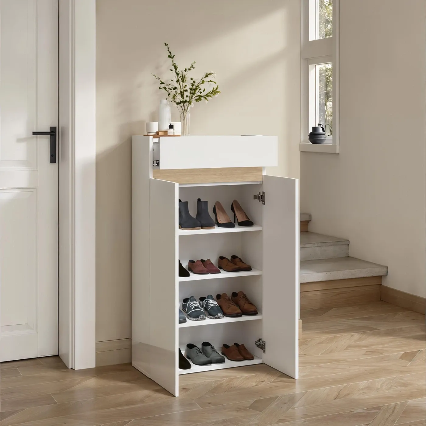 Questa scarpiera è stata pensata per essere posto in ingressi o corridoi moderni grazie alla sua struttura slanciata e ai colori neutri.