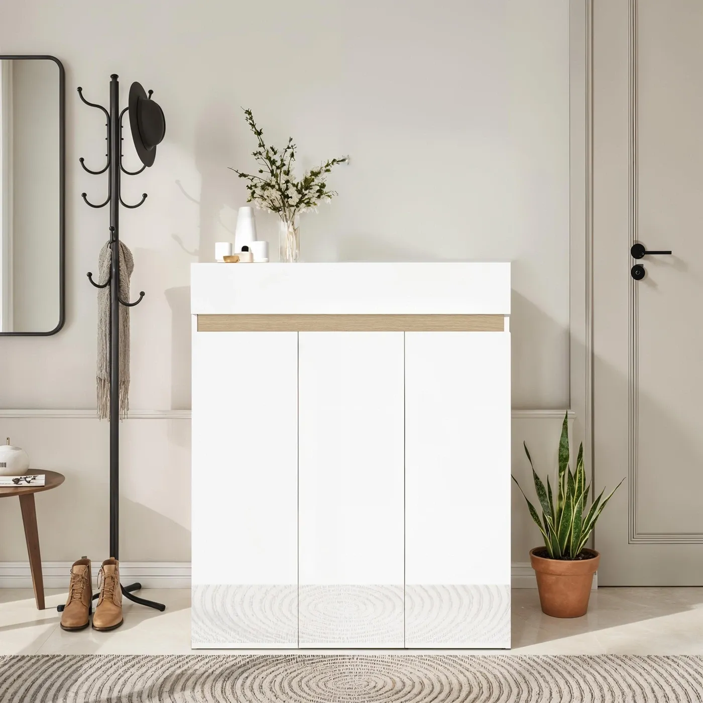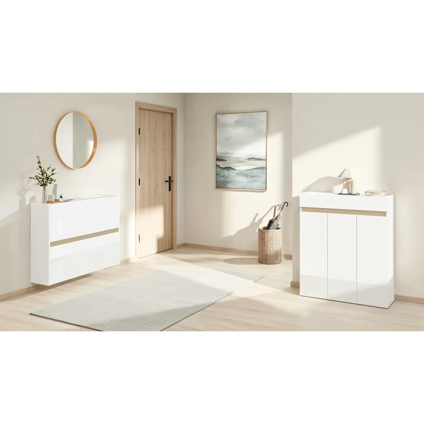 Scarpiera a 3 ante un cassetto e 10 ripiani, L.94 H.114 P.35, Bianco Lucido e Rovere Lindberg