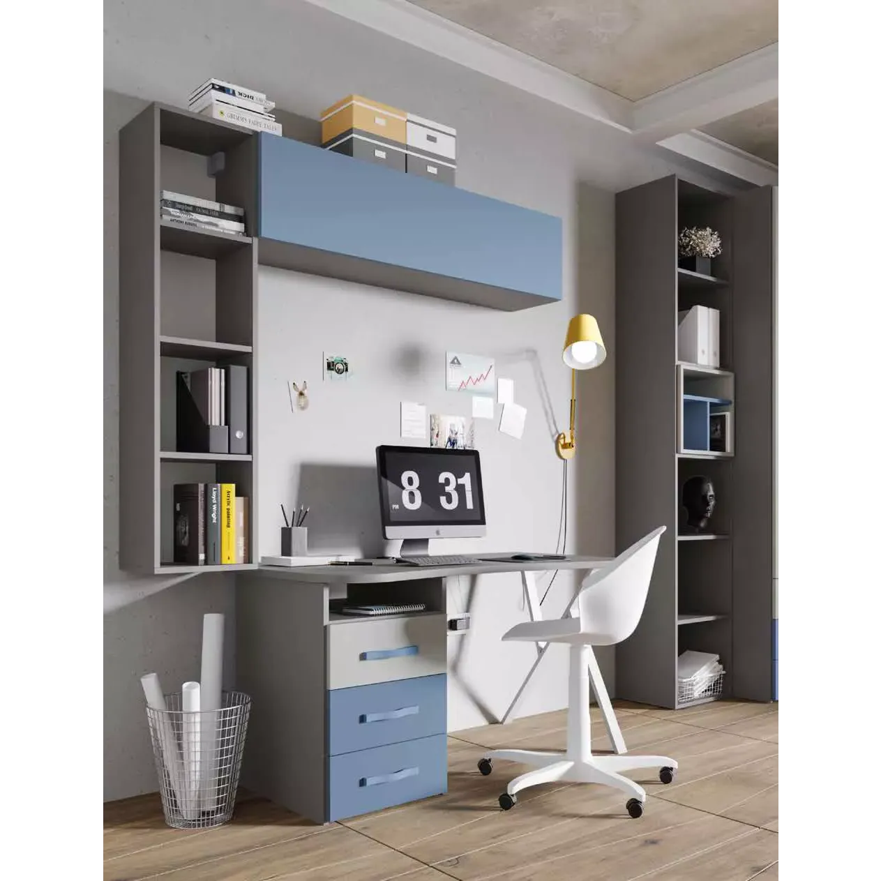 Le finiture proposte Grigio chiaro e Avio per la scrivania creano un piacevole gioco cromatico che personalizza la cameretta; tramite apposito configuratore è però possibile sostituire i colori con altre tinte, in linea con i propri gusti.