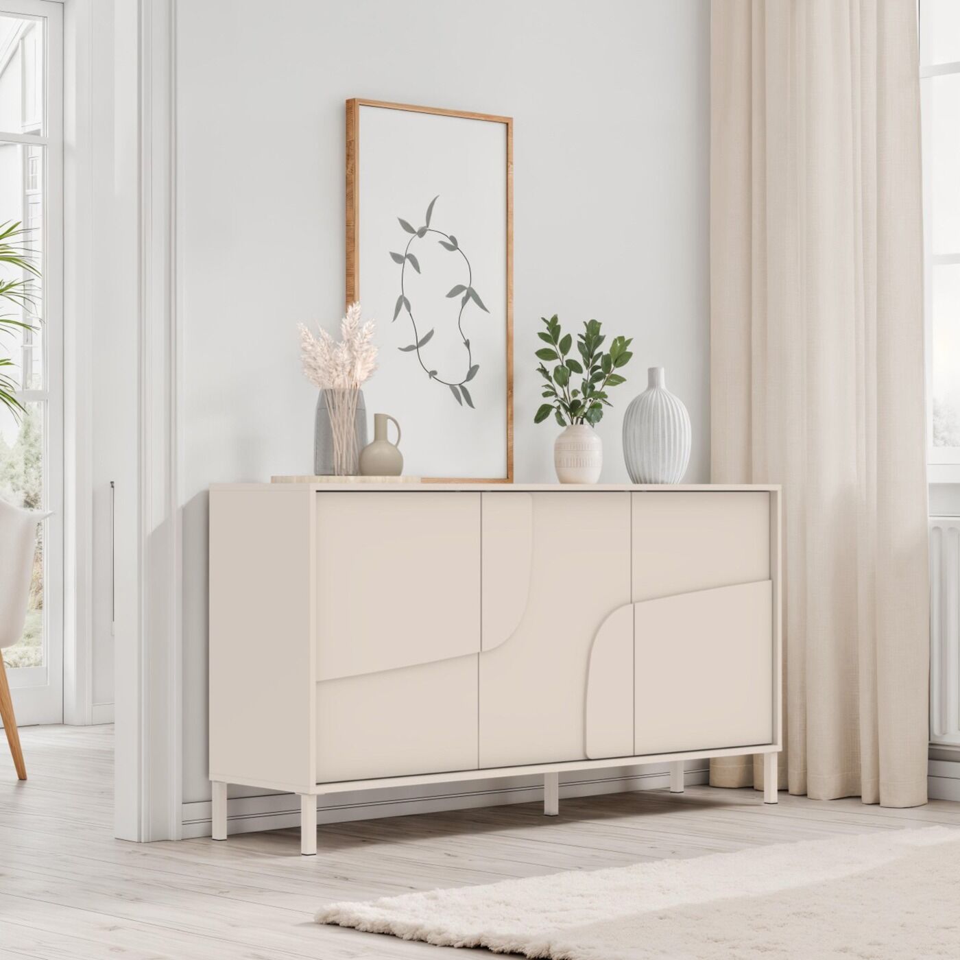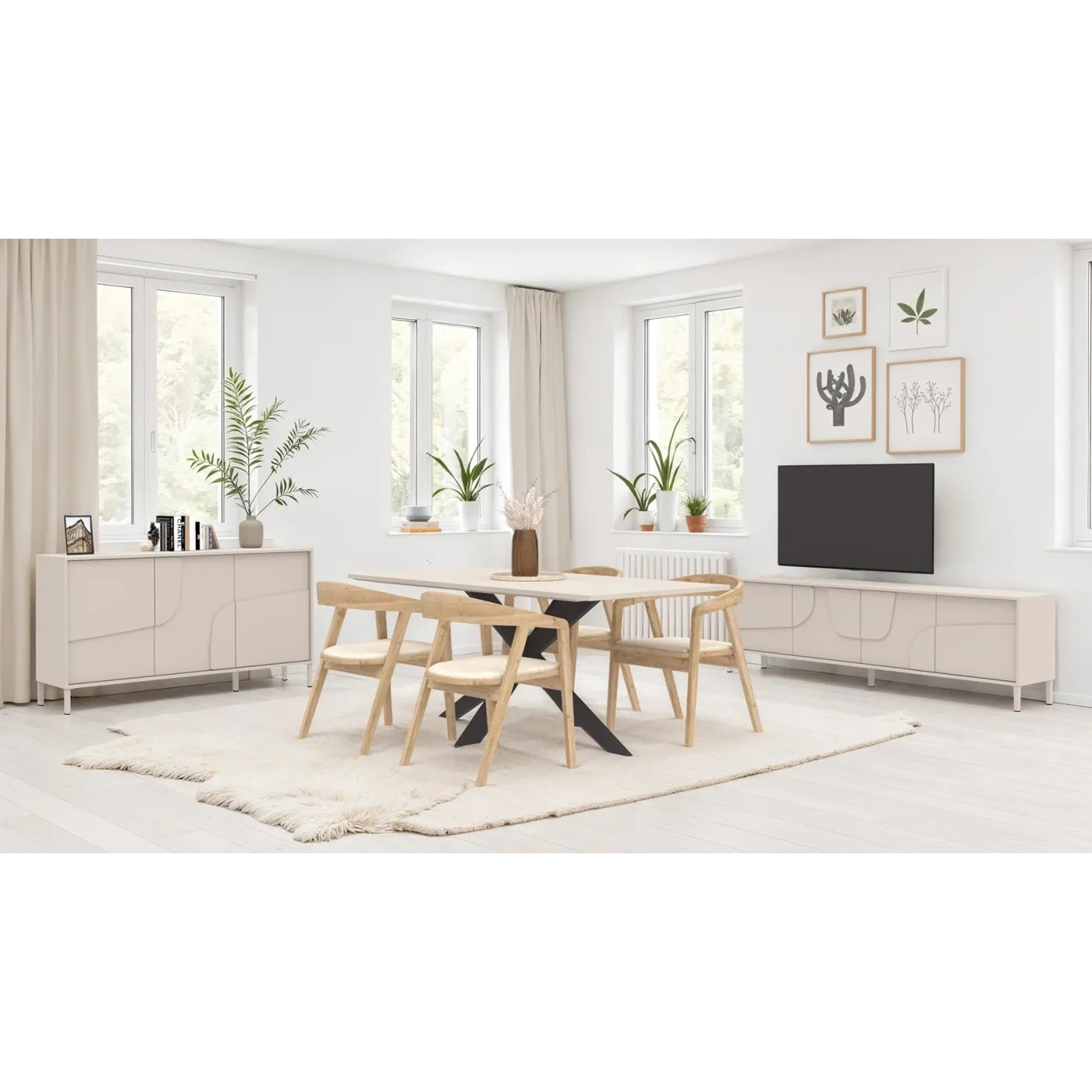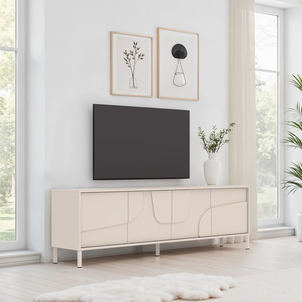 Soggiorno composto di Porta TV a 4 ante e di madia a 3 ante e 2 ripiani con inserto serigrafato. Entrambi sono equipaggiati di piedini metallici. Disponibile in finitura Cashmere.