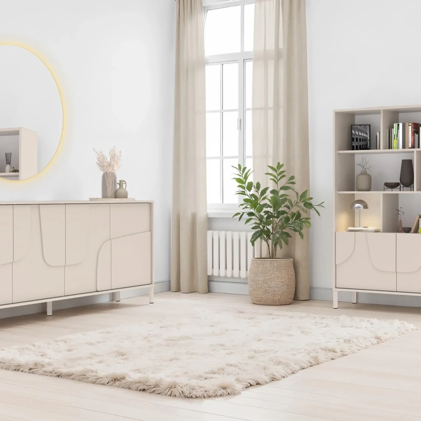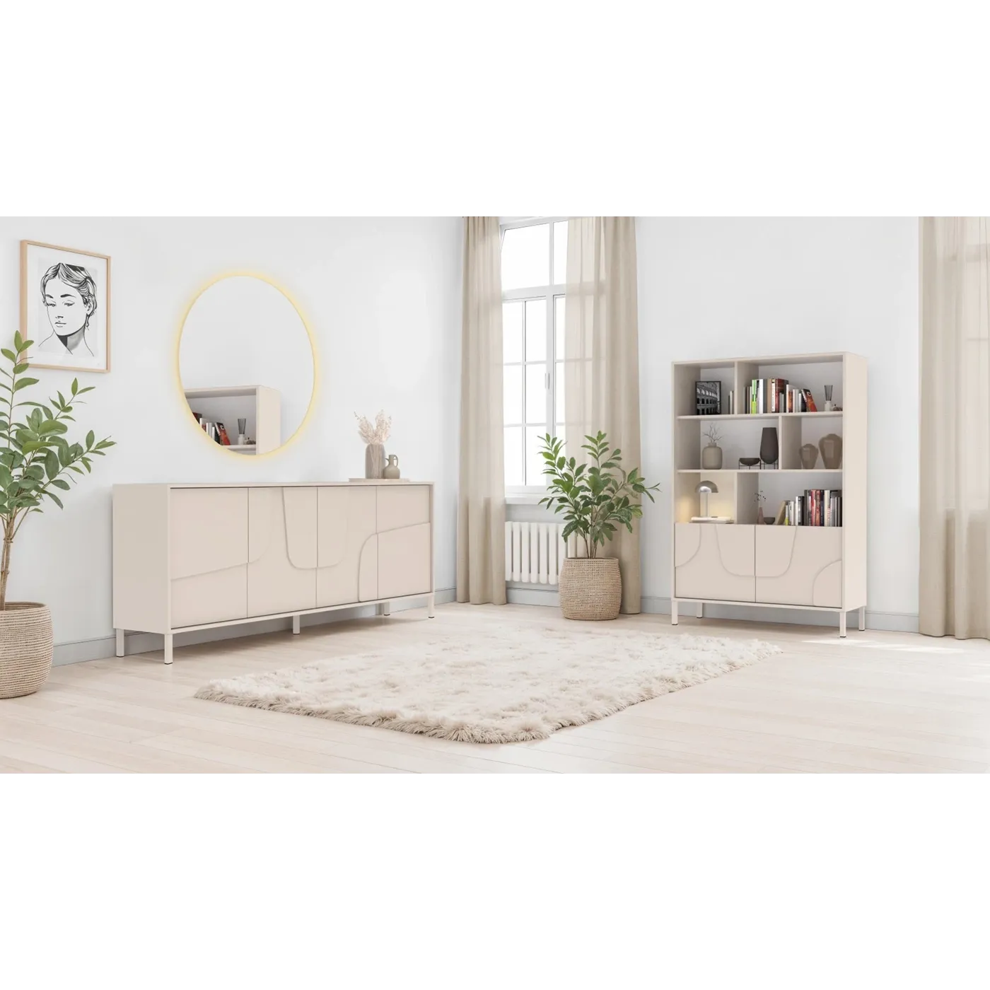 Soggiorno composto di Credenza-Libreria a 2 ante e 2 ripiani e di madia a 4 ante con inserto serigrafato. Entrambi sono equipaggiati di piedini metallici. Disponibile in finitura Cashmere.
