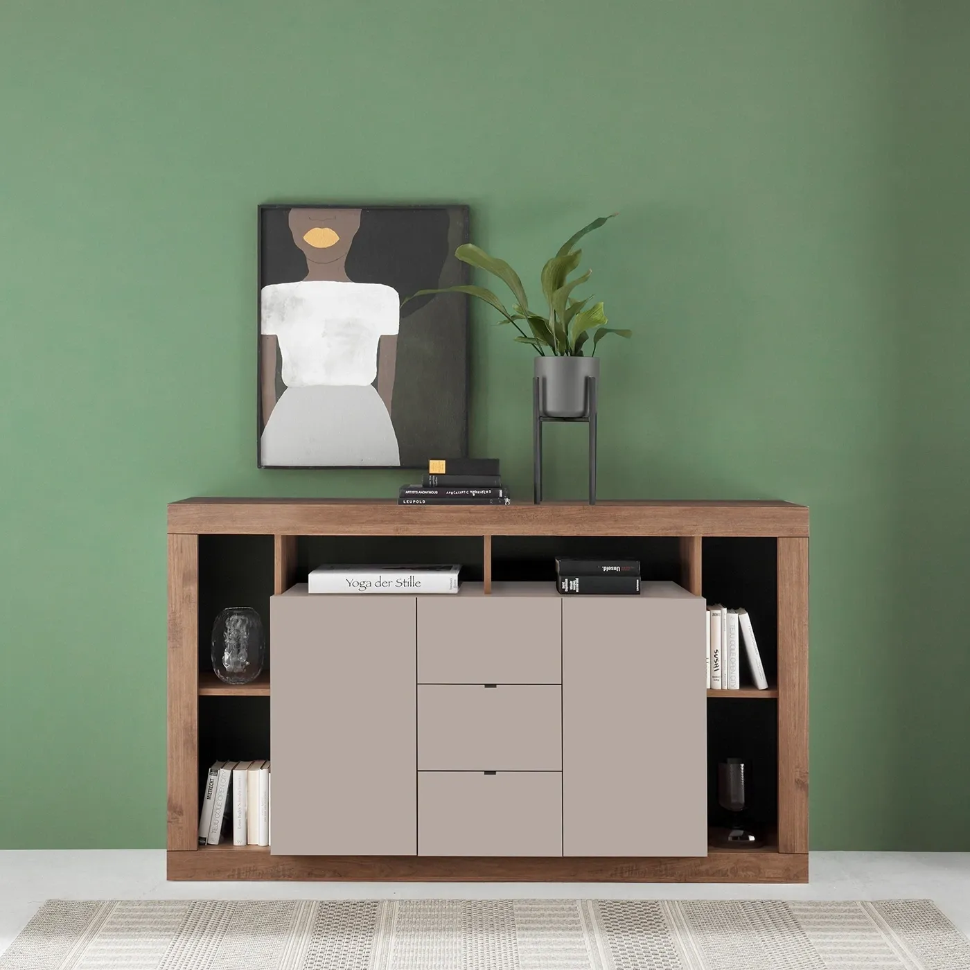 L'articolo prevede un allestimento di 2 ante e all'interno di un ripiano, il tutto colorato con la finitura Cashmere. All'esterno invece è prevista la finitura Mercure per la sovrastruttura, che con il resto della madia forma 5 vani a giorno.