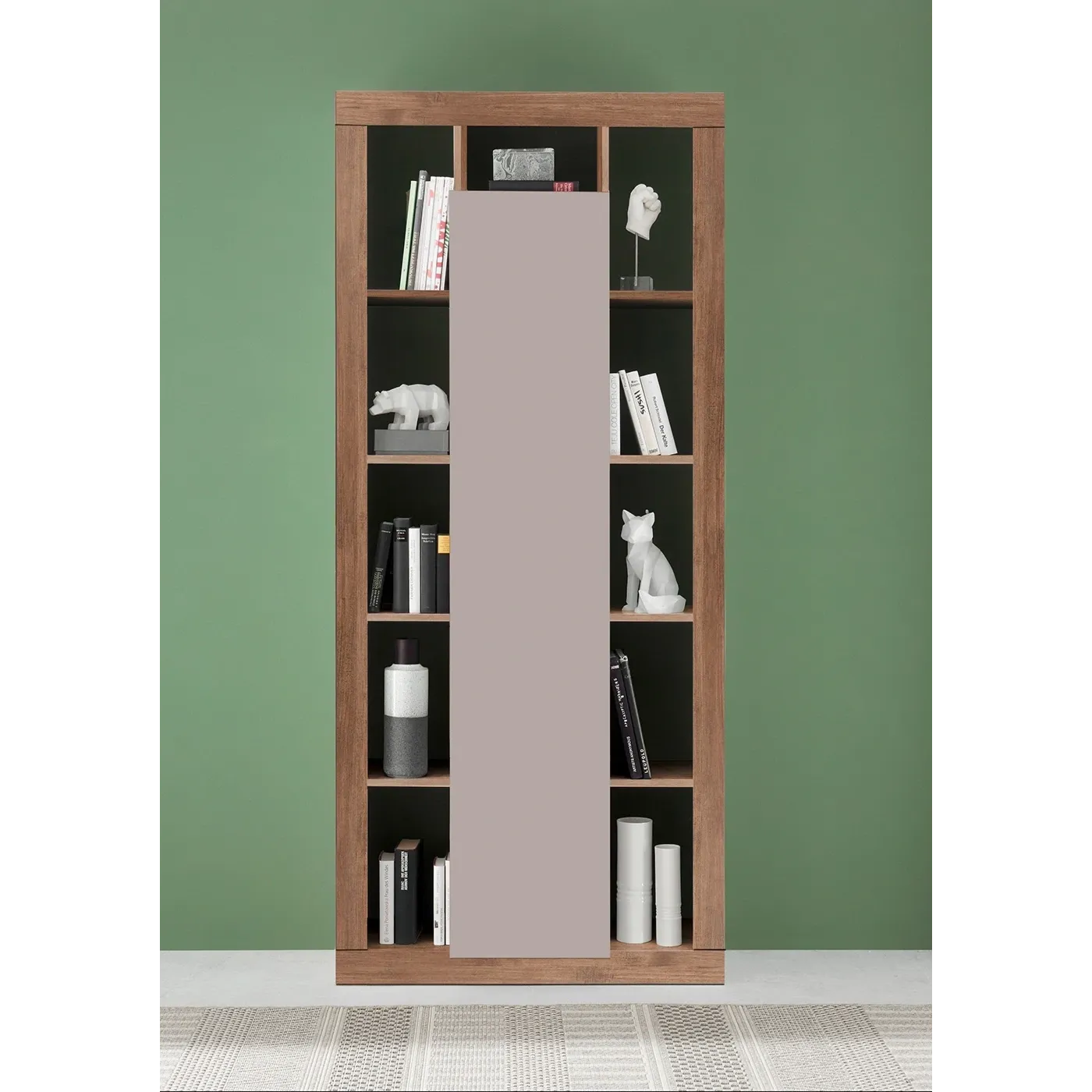 L'articolo prevede un allestimento di un'anta e di 4 ripiani al suo interno, il tutto colorato con la finitura Cashmere. All'esterno invece è prevista la finitura Mercure per la sovrastruttura, che con il resto della madia forma 9 vani a giorno.