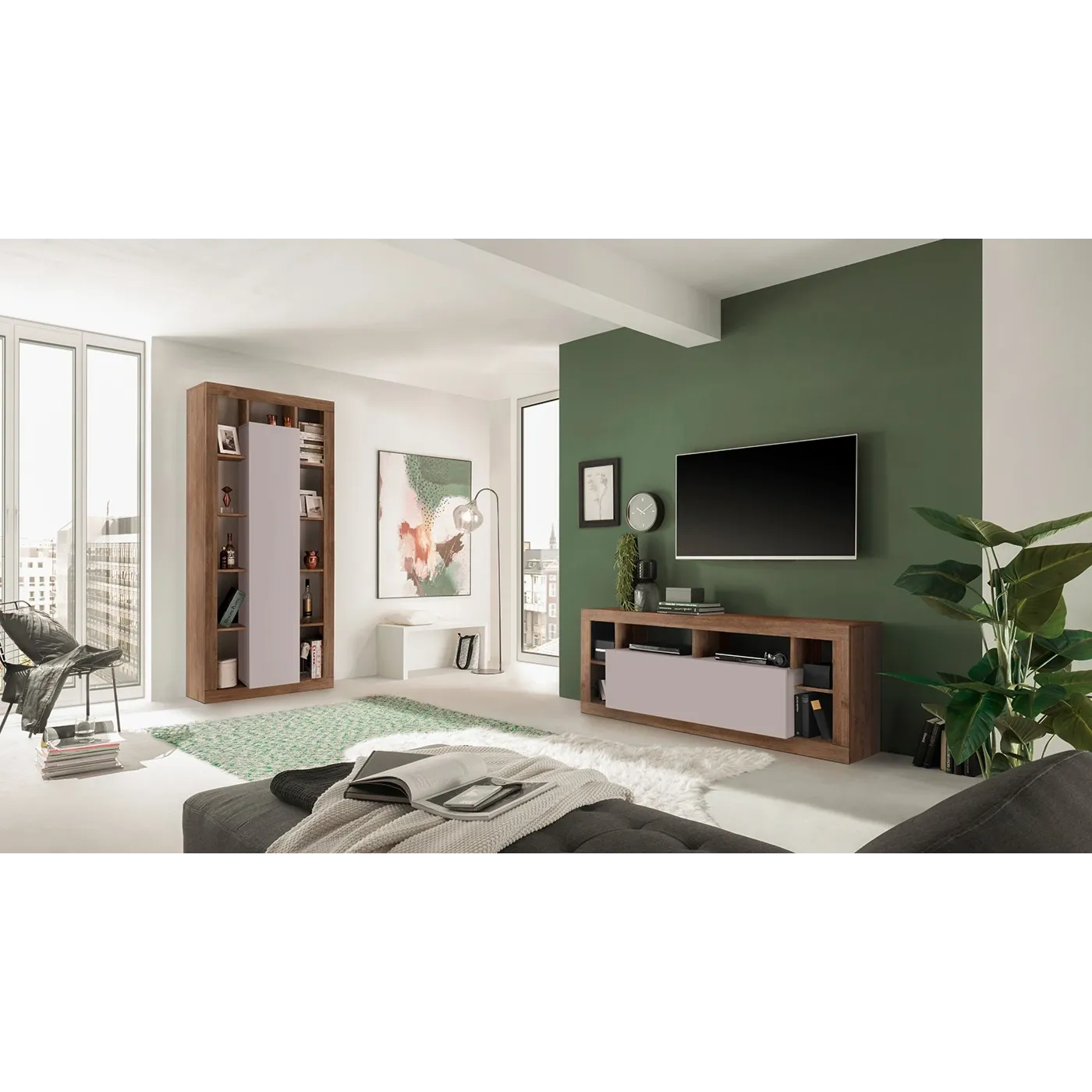 Soggiorno moderno composto da porta TV ad un'anta e con doppio scomparto interno e una madia alta ad un'anta, entrambi nella doppia finitura Cashmere e Mercure.
