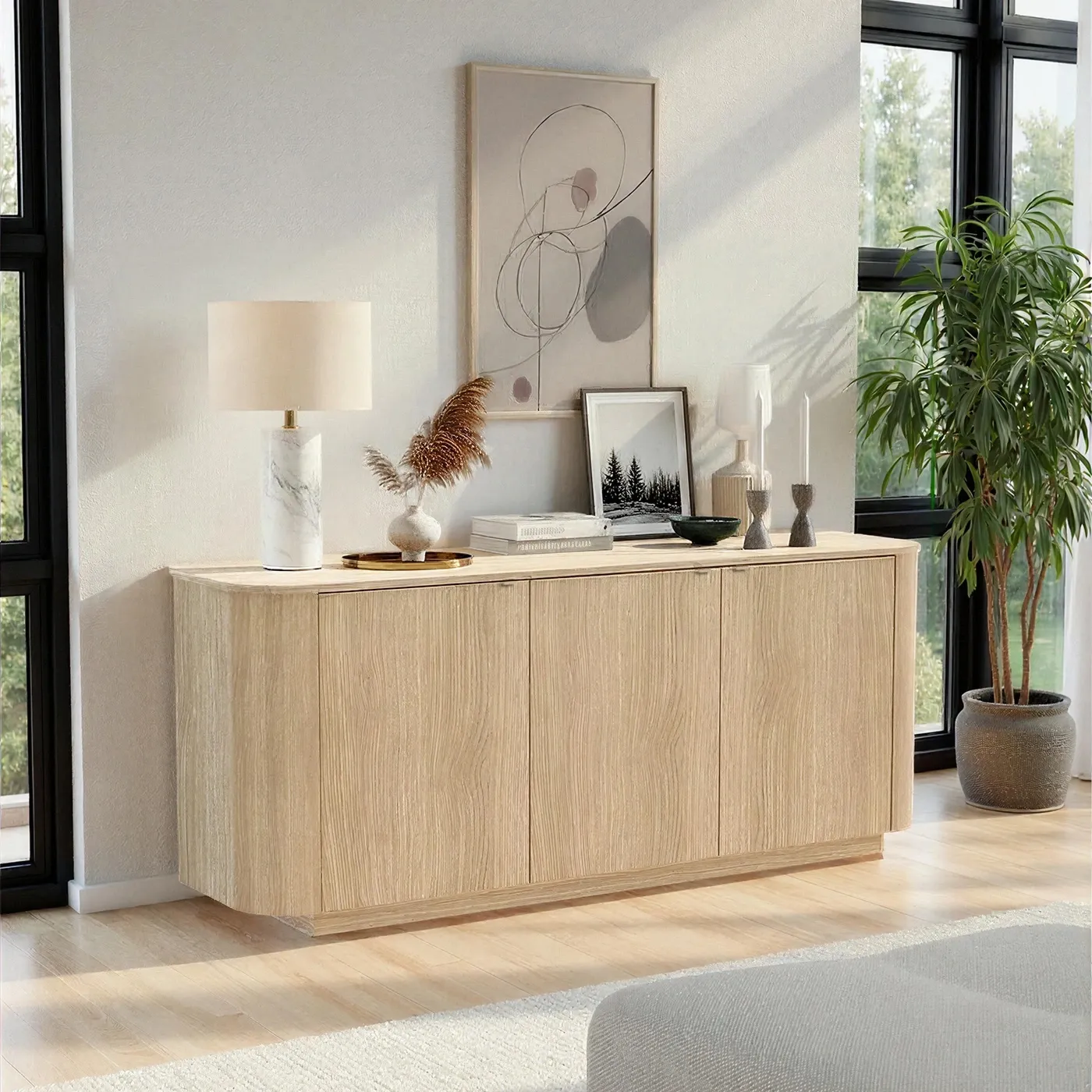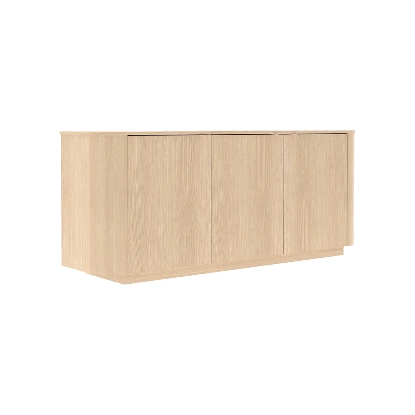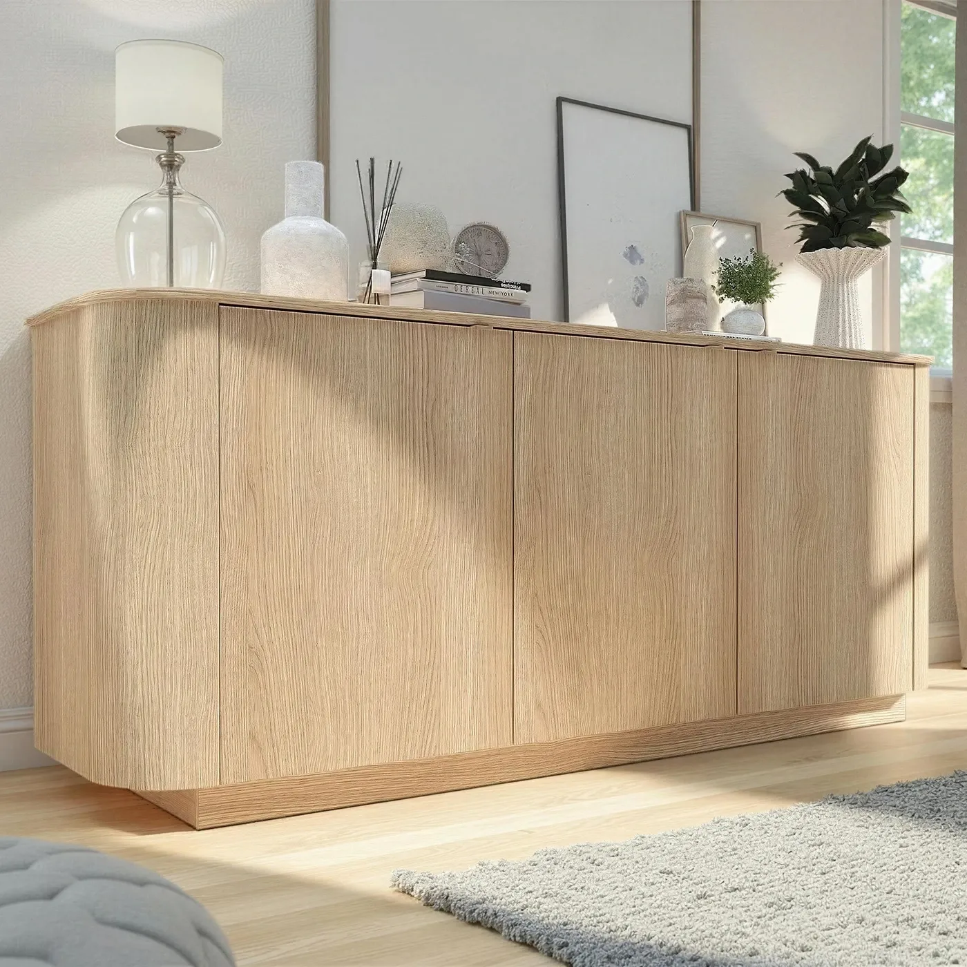 Nuovo soggiorno composto di 2 madie, di cui una funge da mobile porta TV, entrambe caratterizzate dallo stiloso dettaglio degli angoli e dei fianchi arrotondati. Disponibile in finitura Rovere Lindberg.