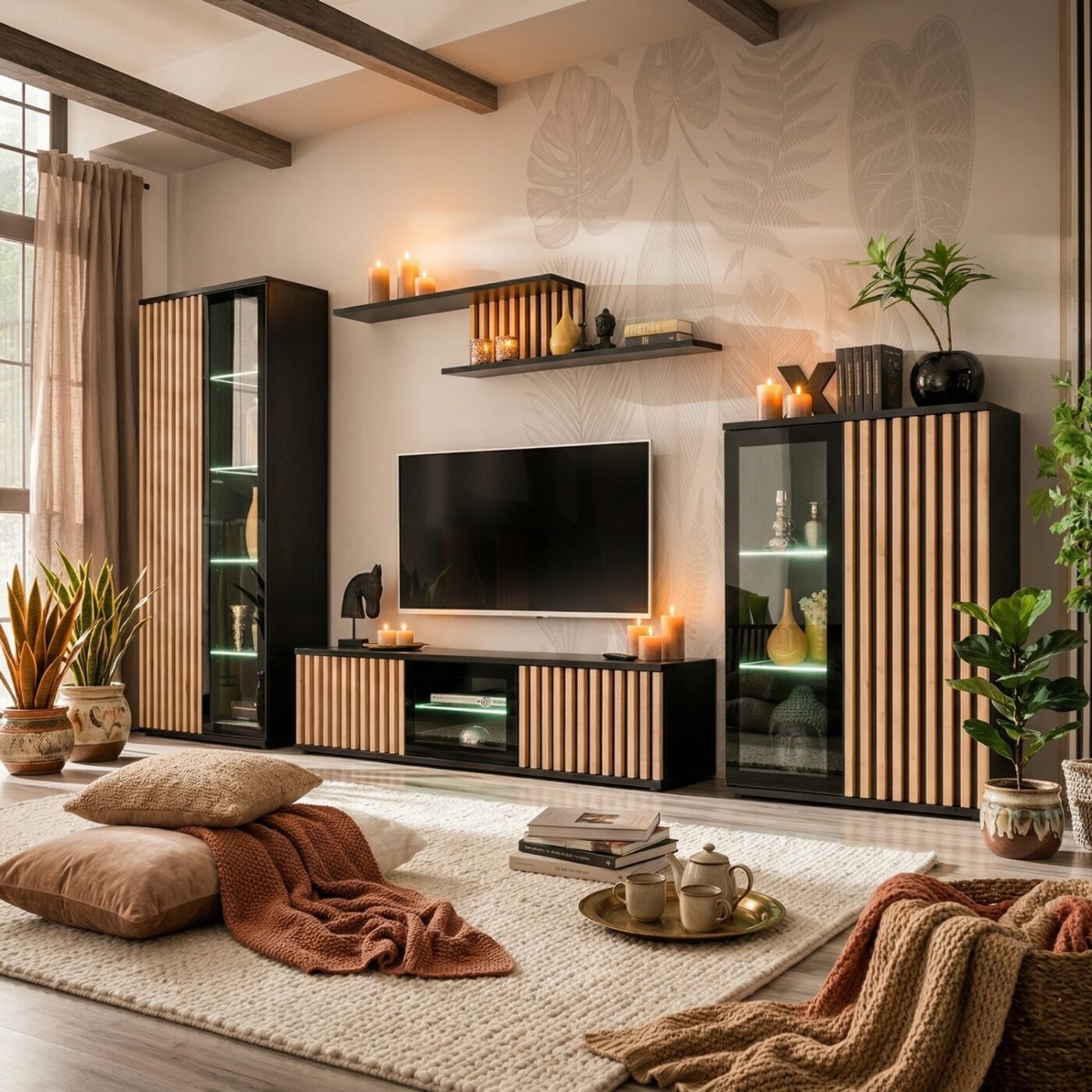 Soggiorno attrezzato della collezione Flame, caratterizzato dalla doppia colorazione Nero e Frassino olivato e con pannelli e ante in Cannettato.