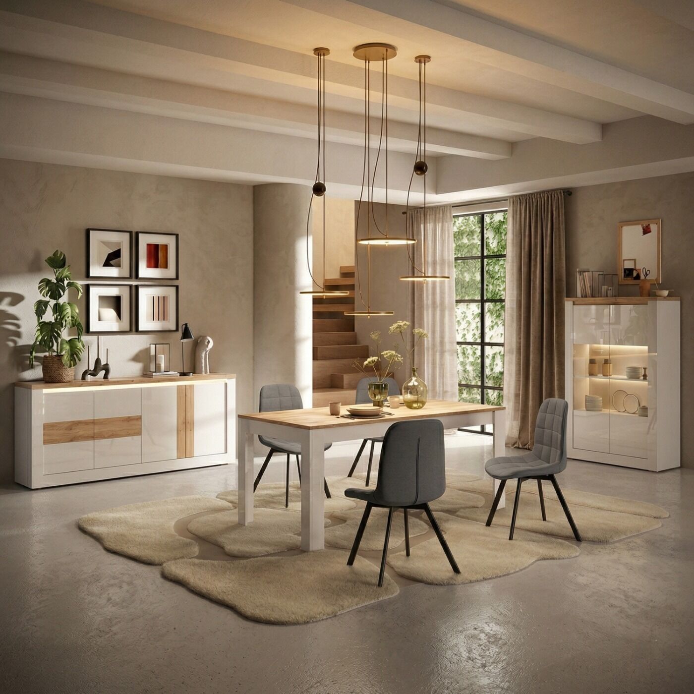 Soggiorno moderno composto da un tavolo, una madia a 4 ante e una vetrina a 2 ante. Si distingue per la doppia colorazione in Bianco lucido e Cadiz.