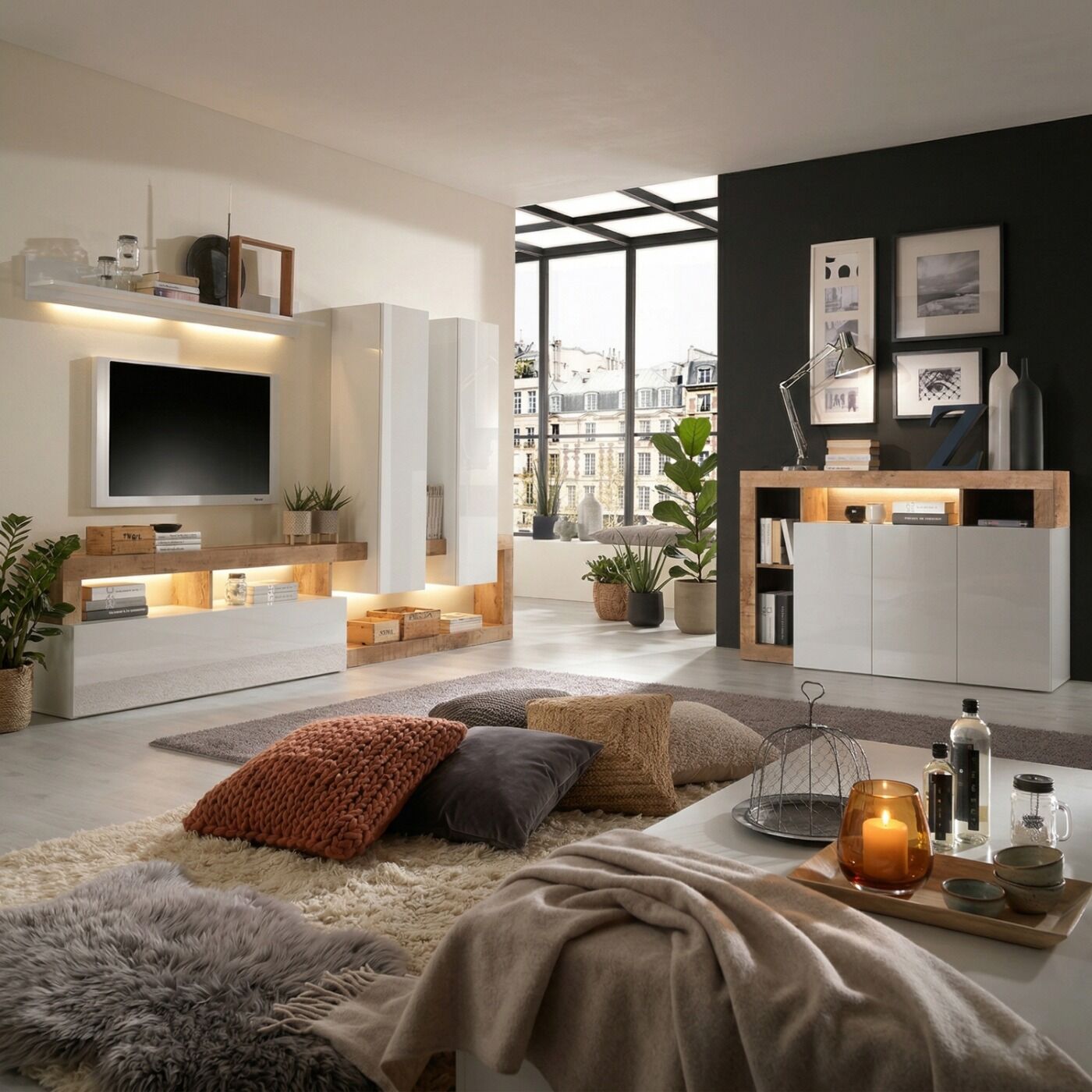 Soggiorno moderno di design in fintura bianco laccato lucido e pero. Questo soggiorno rende il tuo living unico e di tendenza. Grazie al suo design geometrico si adatta a tutti gli ambienti. La struttura della madia e della parete attrezzata in finitura pero crea un gioco di forme donando un ampio spazio per riporre oggetti.
