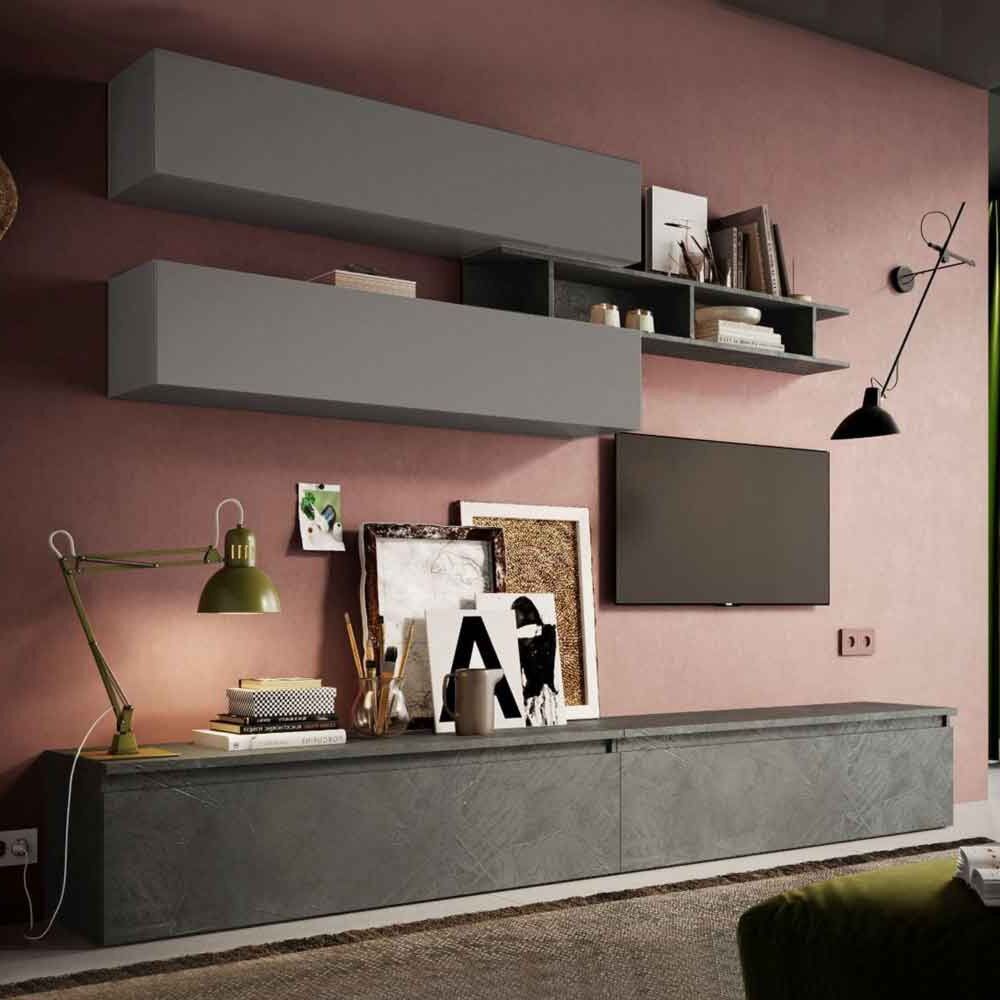 La parete attrezzata nella finitura Ardesia e Piombo risulta molto pratica da adattare allo spazio del proprio salotto, essa è infatti una parete attrezzata dal design giovane e elegante, concepita per brillare e non stancare mai grazie alla sua linea moderna e dal design fresco è capace di adattarsi a diversi stili di arredamento, fornendoti tanto spazio utile per tenere tutto in ordine.