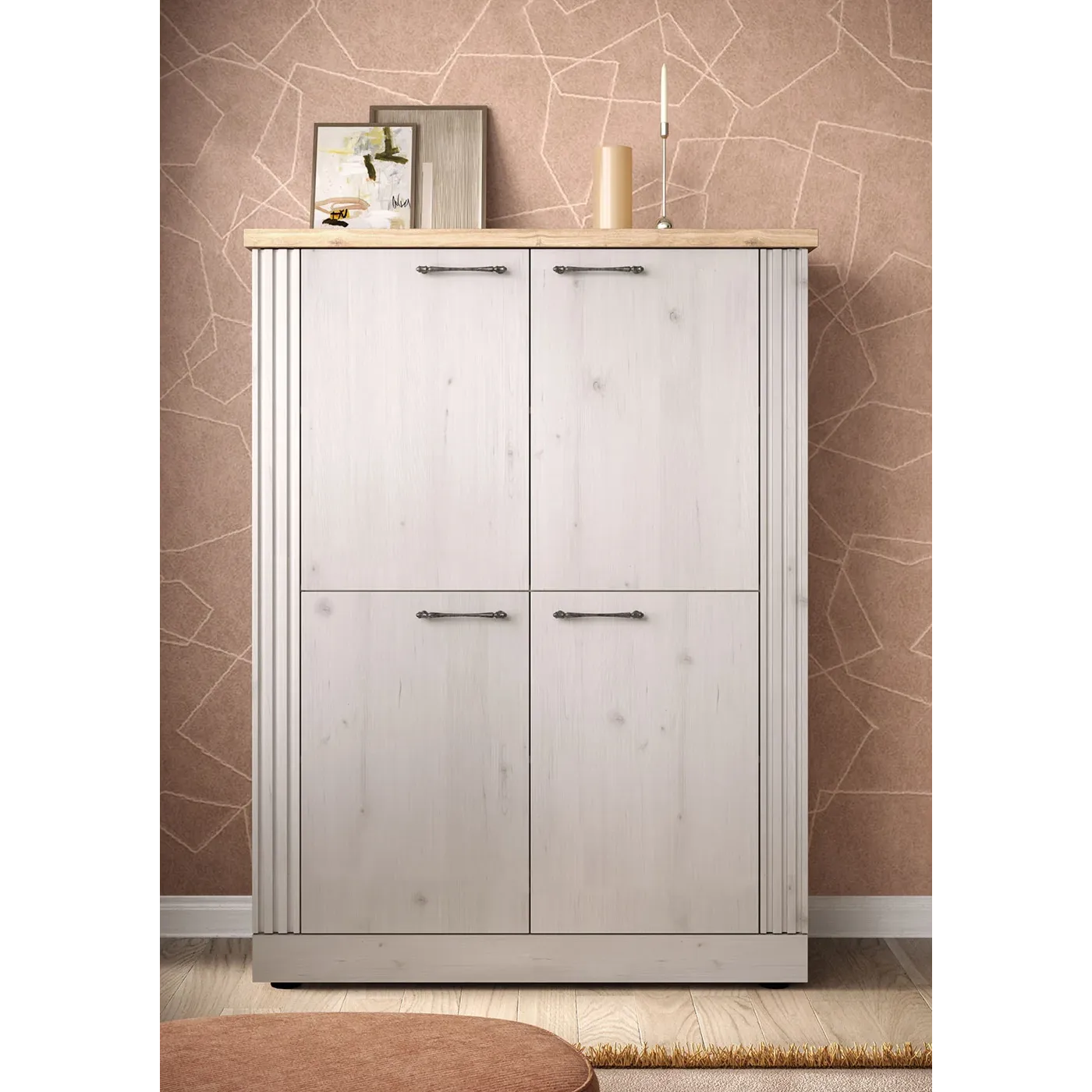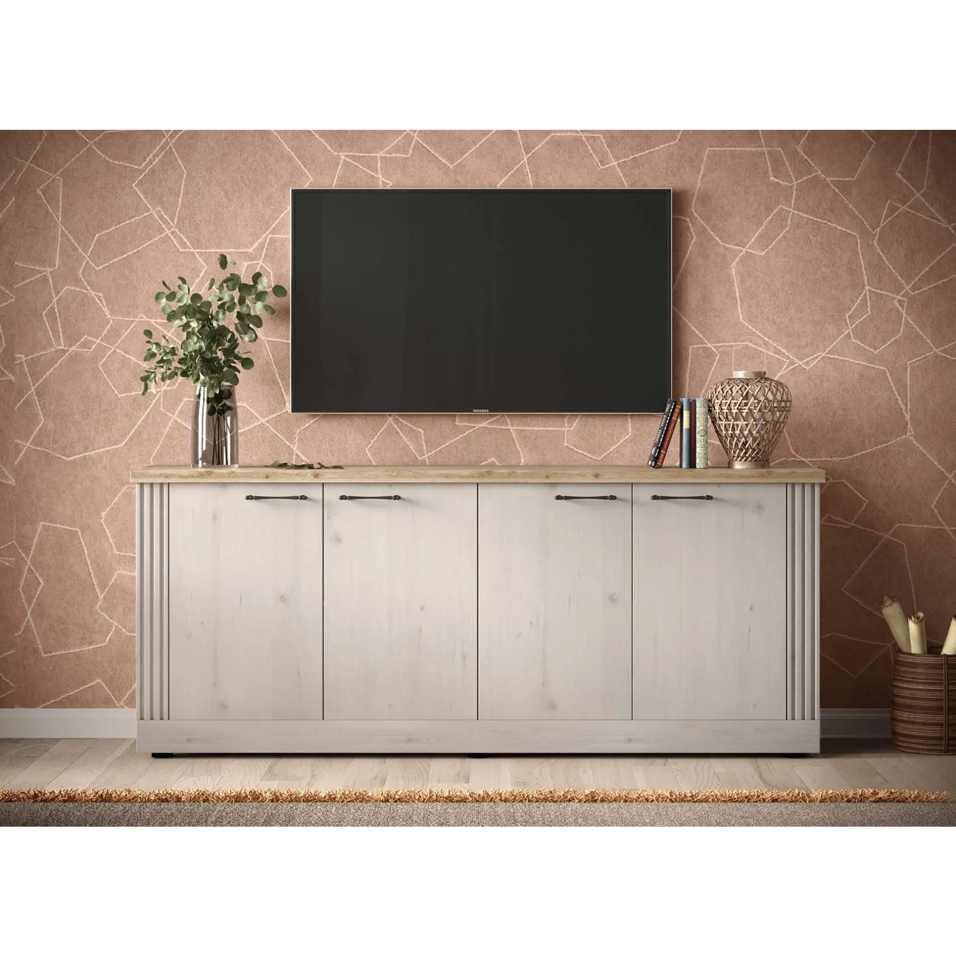 Il design caratteristico del soggiorno riporta allo stile Shabby: la lavorazione delle maniglie, la ricercatezza nei dettagli dei frontali e le calde finiture Rovere meringa e Cadiz offrono un arredo senza tempo, capace di personalizzare al meglio ogni ambiente, e creano luce e armonia, assicurando al living calore e carattere.