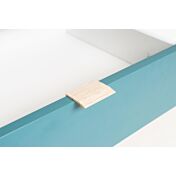 Tavolino di design con gambe in legno, 2 cassetti e 2 vani a giorno, finitura Quercia, Bianca, Petrolio e Grigio, la struttura è in melaminico. Progettato per donare nuove e antiche emozioni, si adatta con rara sobrietà alla casa moderna. Uno stile nordico ricercato e di qualità.