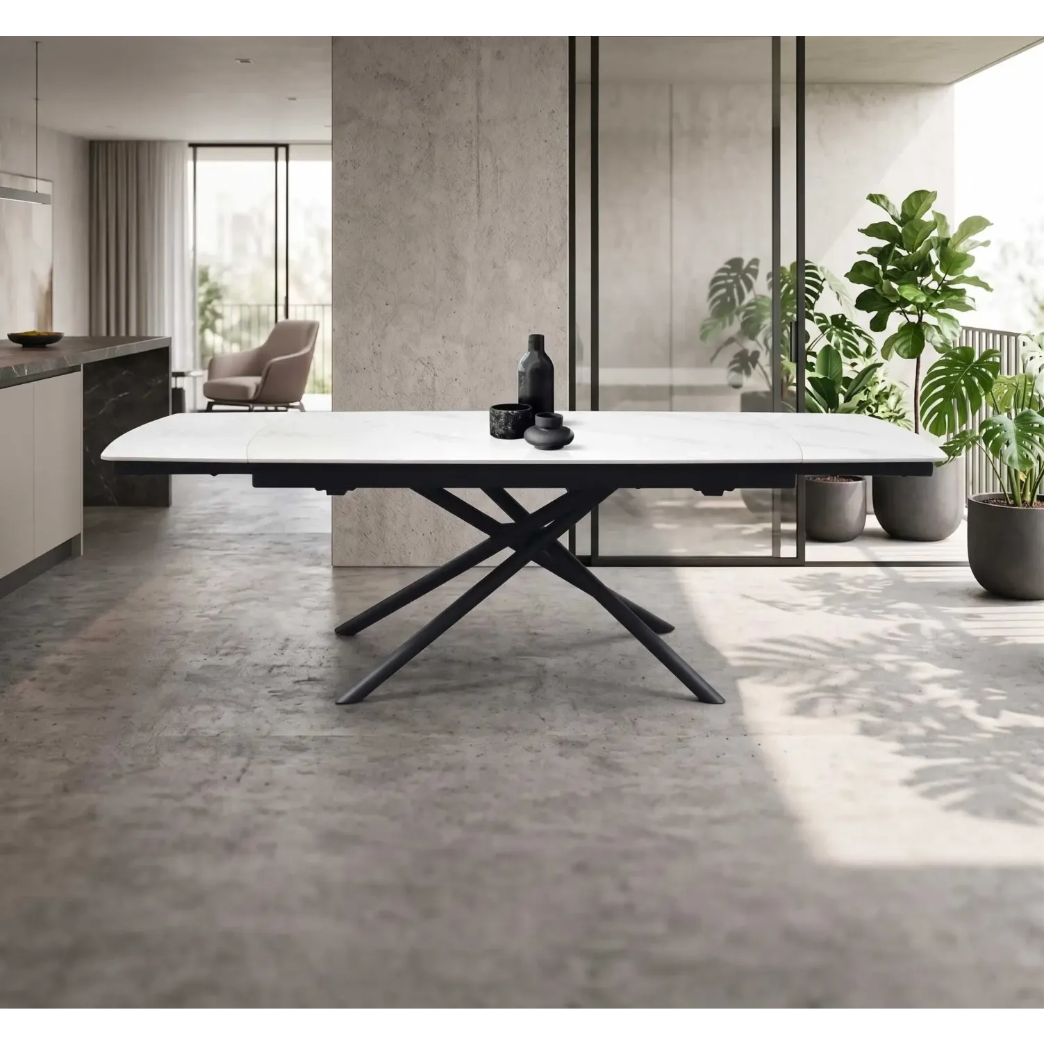 Il top rettangolare in ceramica bianca opaca, dai bordi dolcemente smussati, richiama l'estetica nobile dei marmi naturali, regalando una profondità visiva di grande impatto. La silhouette sottile del piano custodisce un meccanismo di allunga integrato: una soluzione pratica che rispetta l'equilibrio formale e la purezza delle linee del tavolo.