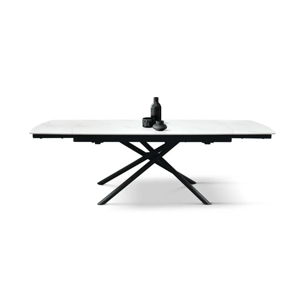 Tavolo allungabile con base in metallo nero con piano opaco arrotondato in ceramica finitura Bianco