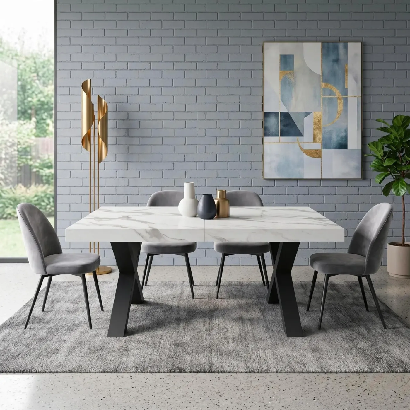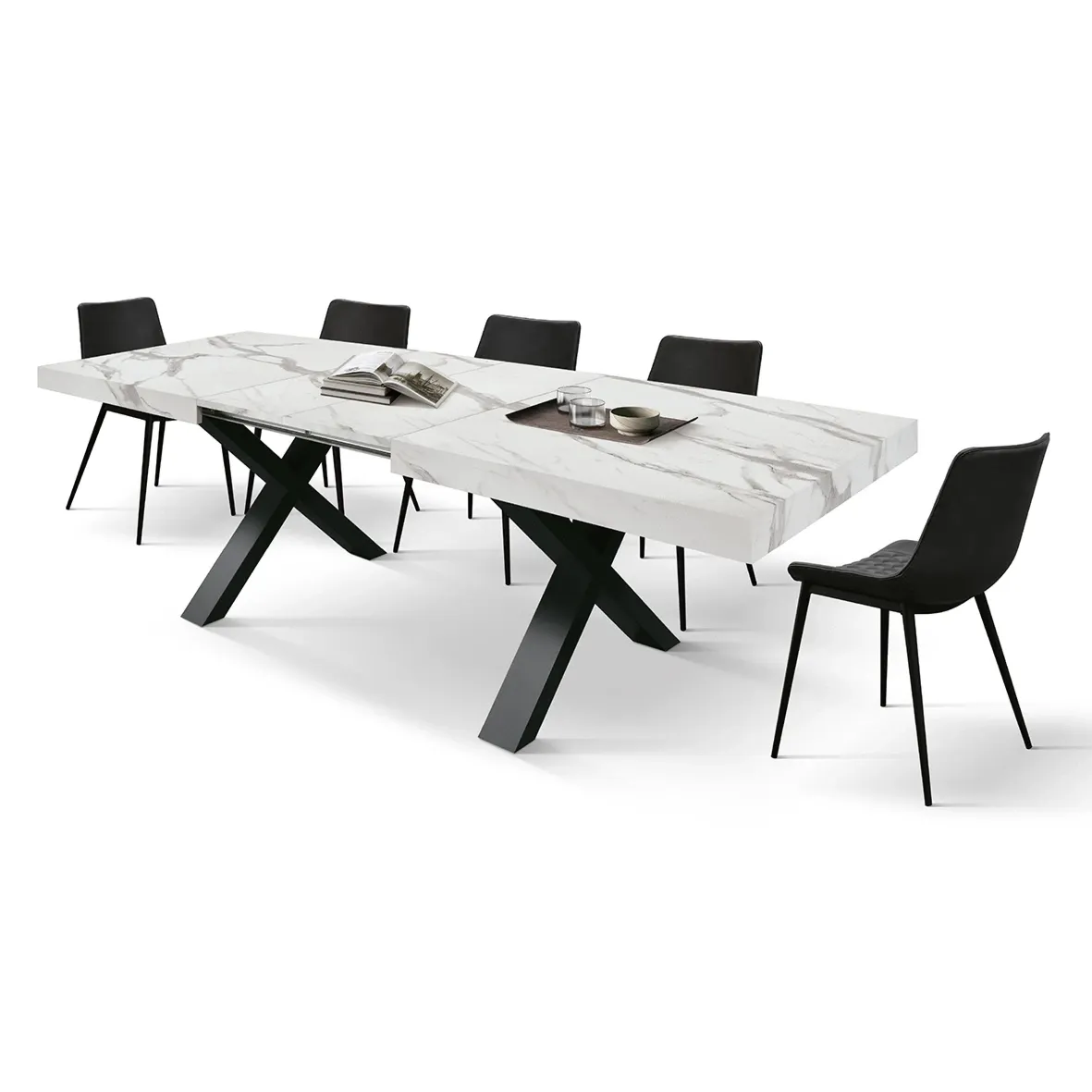 Questo tavolo allungabile con piano in finitura Marmo Bianco rappresenta una sintesi perfetta tra rigore geometrico e raffinatezza classica.
