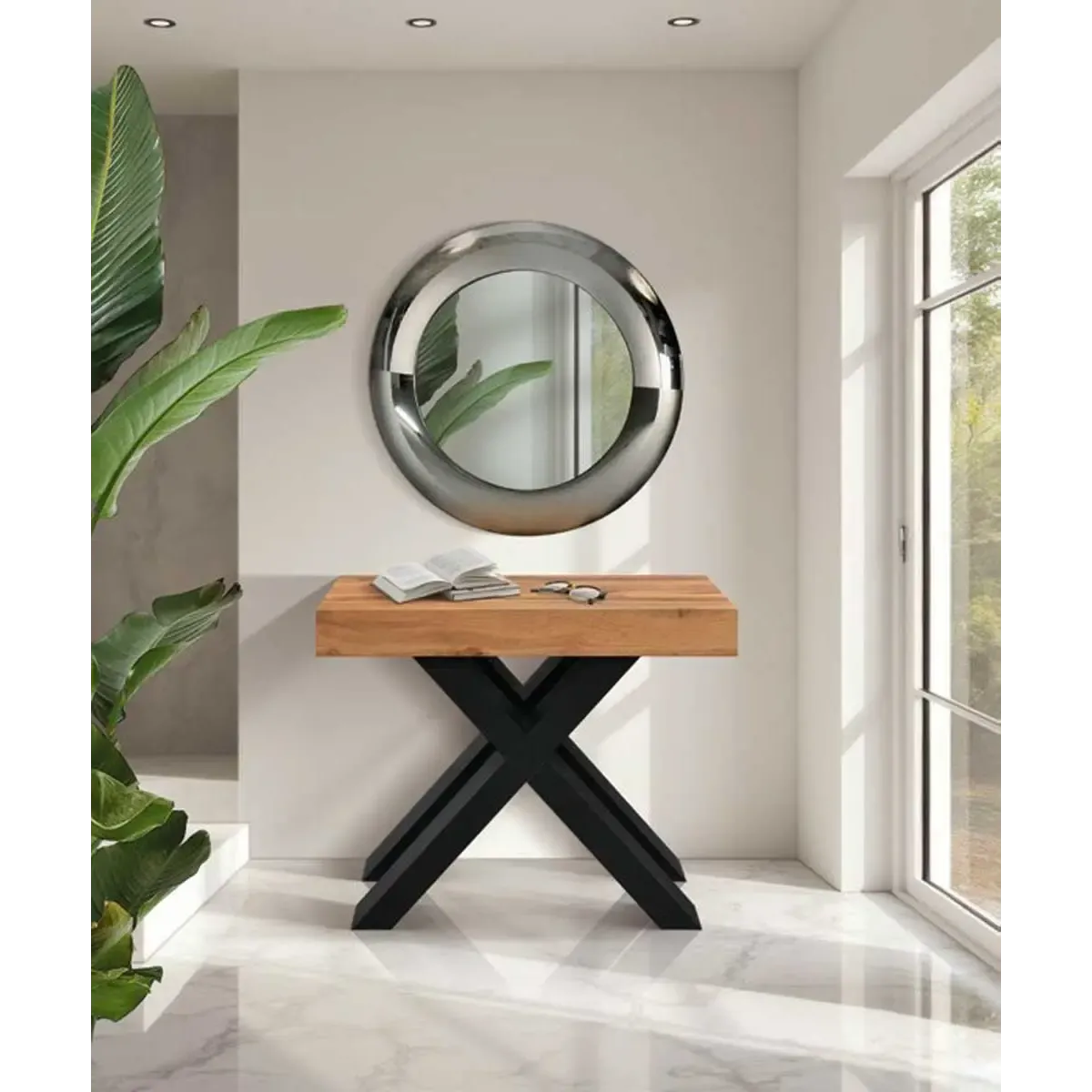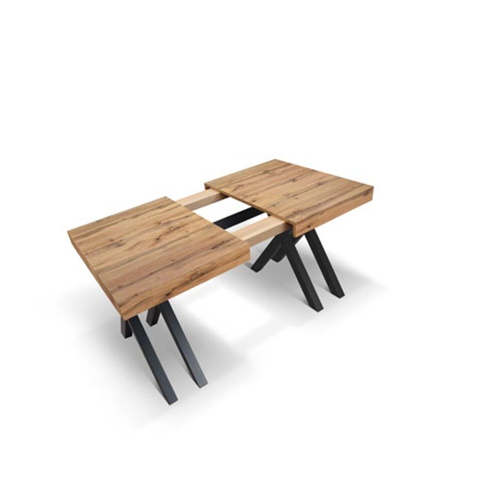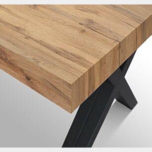 Il contrasto materico è il cuore di questo pezzo: il piano in nobilitato finitura Rovere Rustico regala calore e naturalezza all'ambiente, mostrando venature realistiche e una superficie piacevole al tatto. La struttura è sostenuta da robuste gambe a "X" in MDF rivestito nero, che donano un tocco moderno, deciso e garantiscono una stabilità impeccabile anche alla massima estensione.