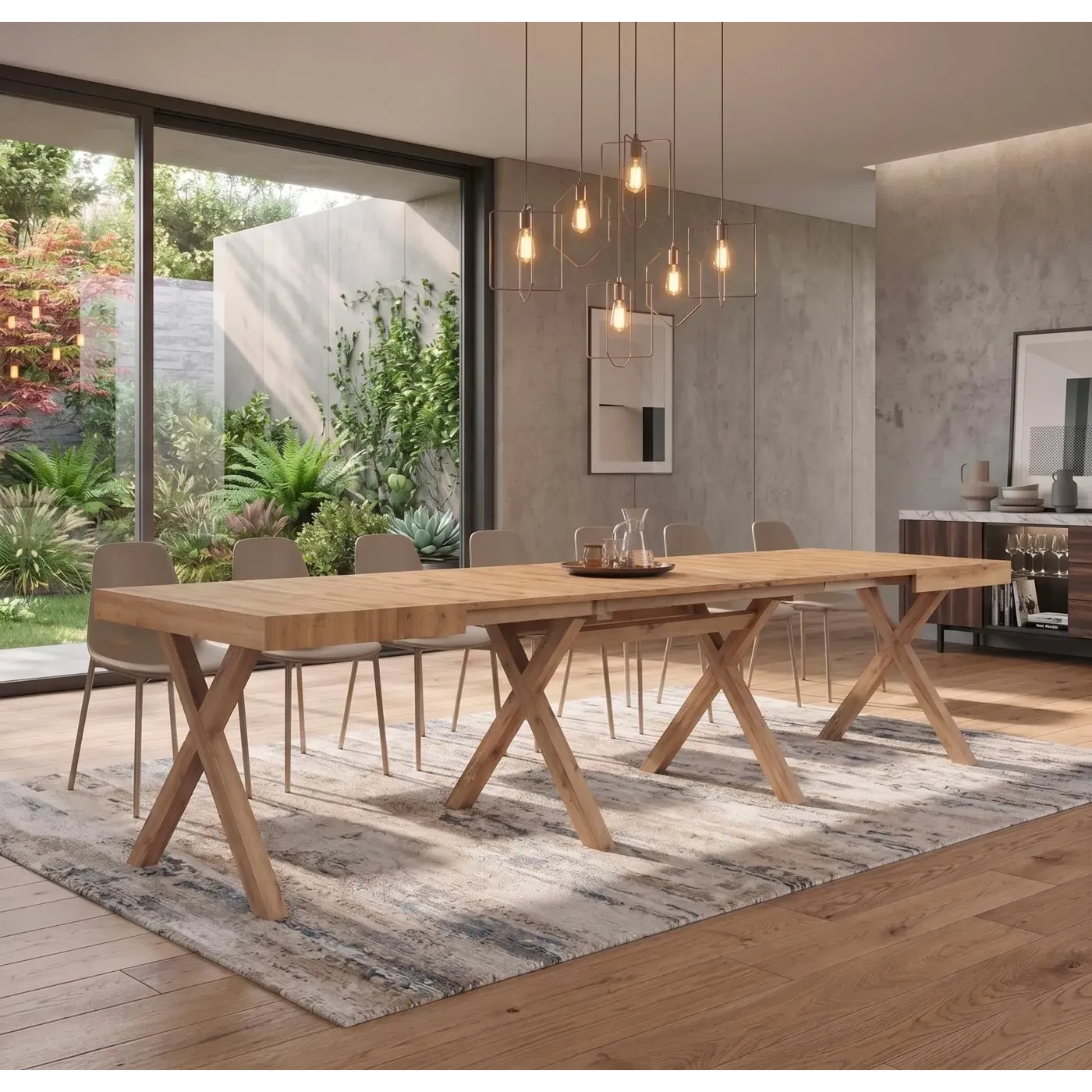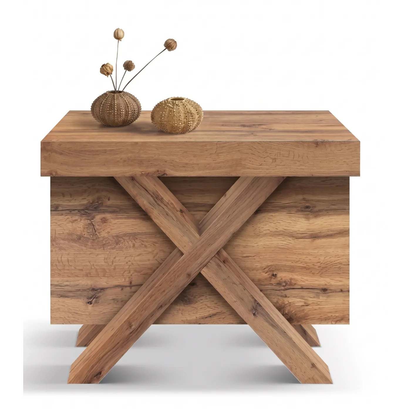 Il contrasto materico è il cuore di questo pezzo: il piano in nobilitato finitura Rovere Rustico regala calore e naturalezza all'ambiente, mostrando venature realistiche e una superficie piacevole al tatto. La struttura è sostenuta da robuste gambe a "X" in MDF rivestito rovere, che donano un tocco moderno, deciso e garantiscono una stabilità impeccabile anche alla massima estensione.