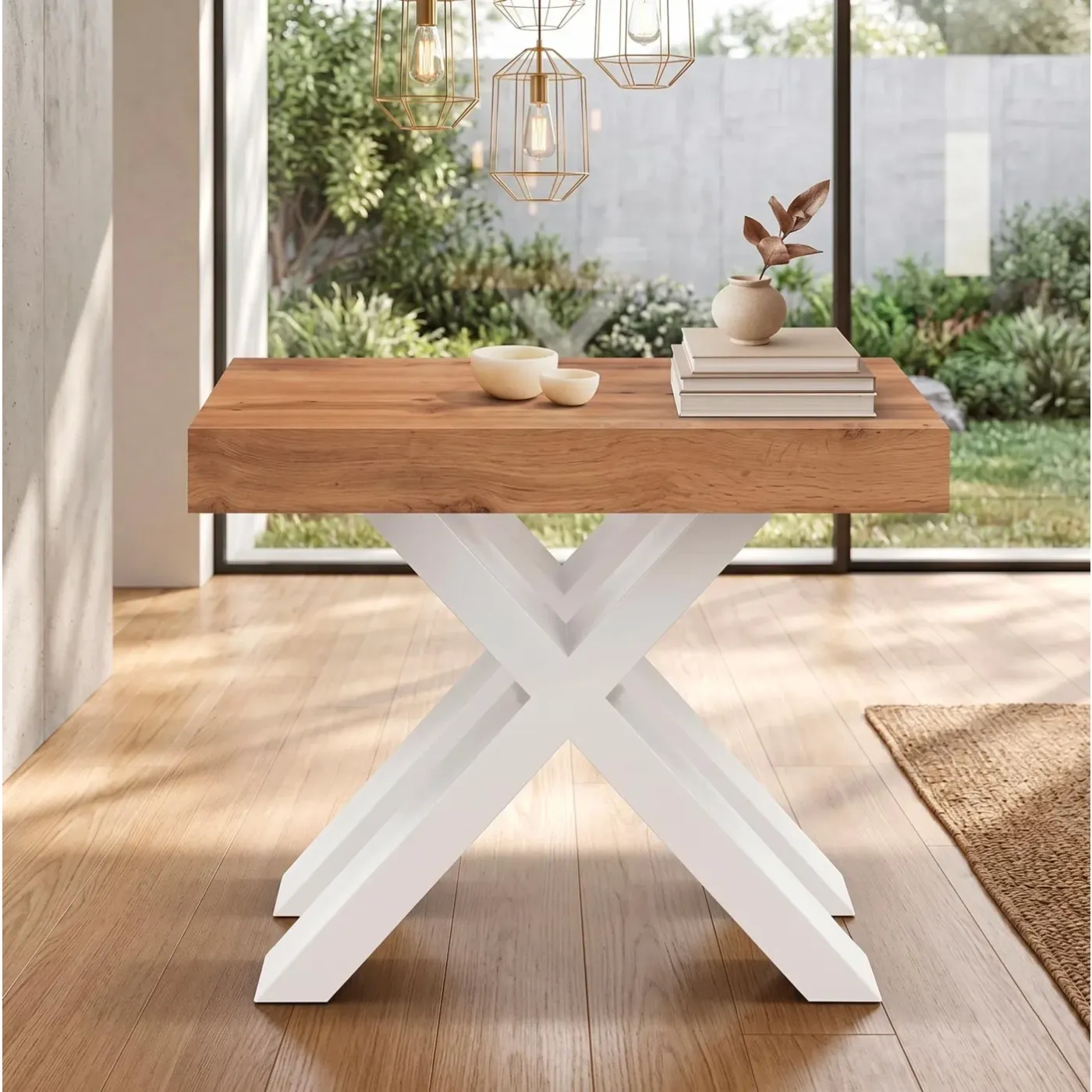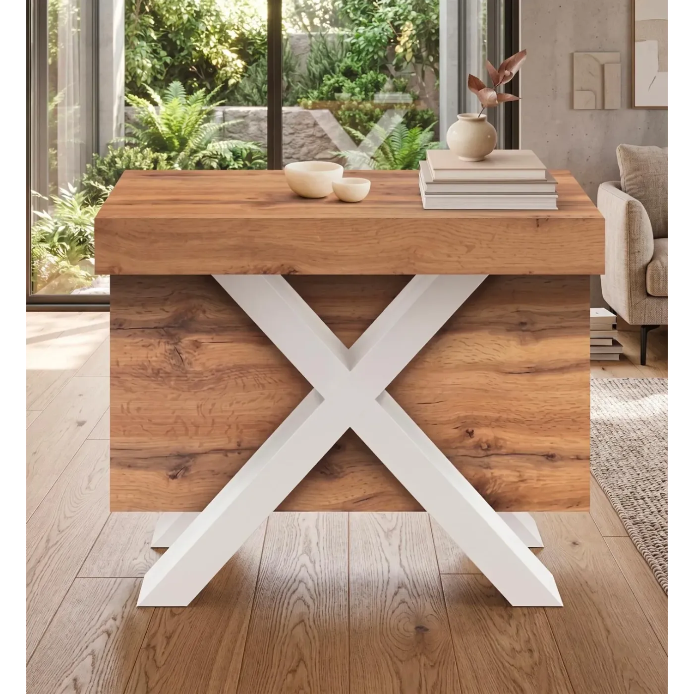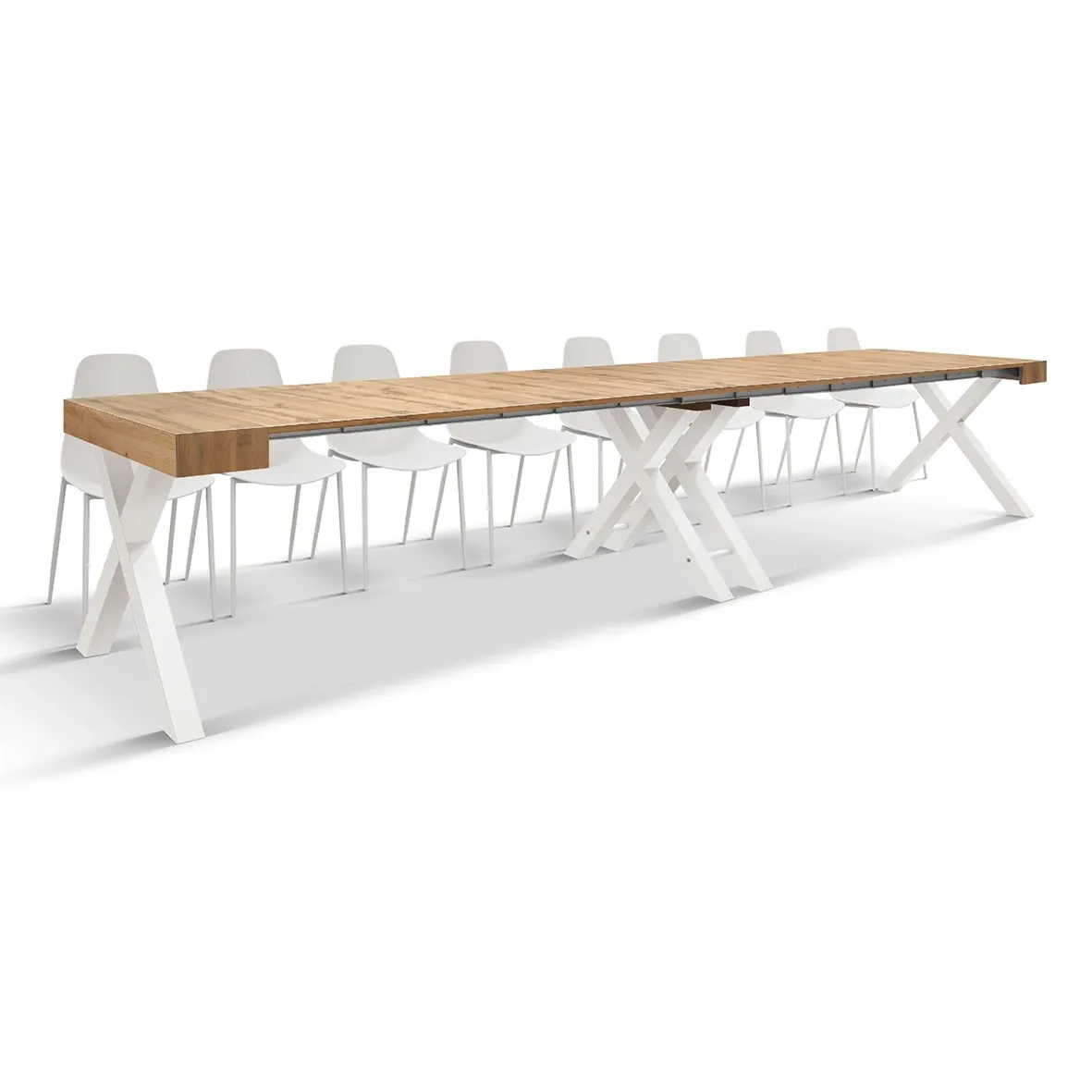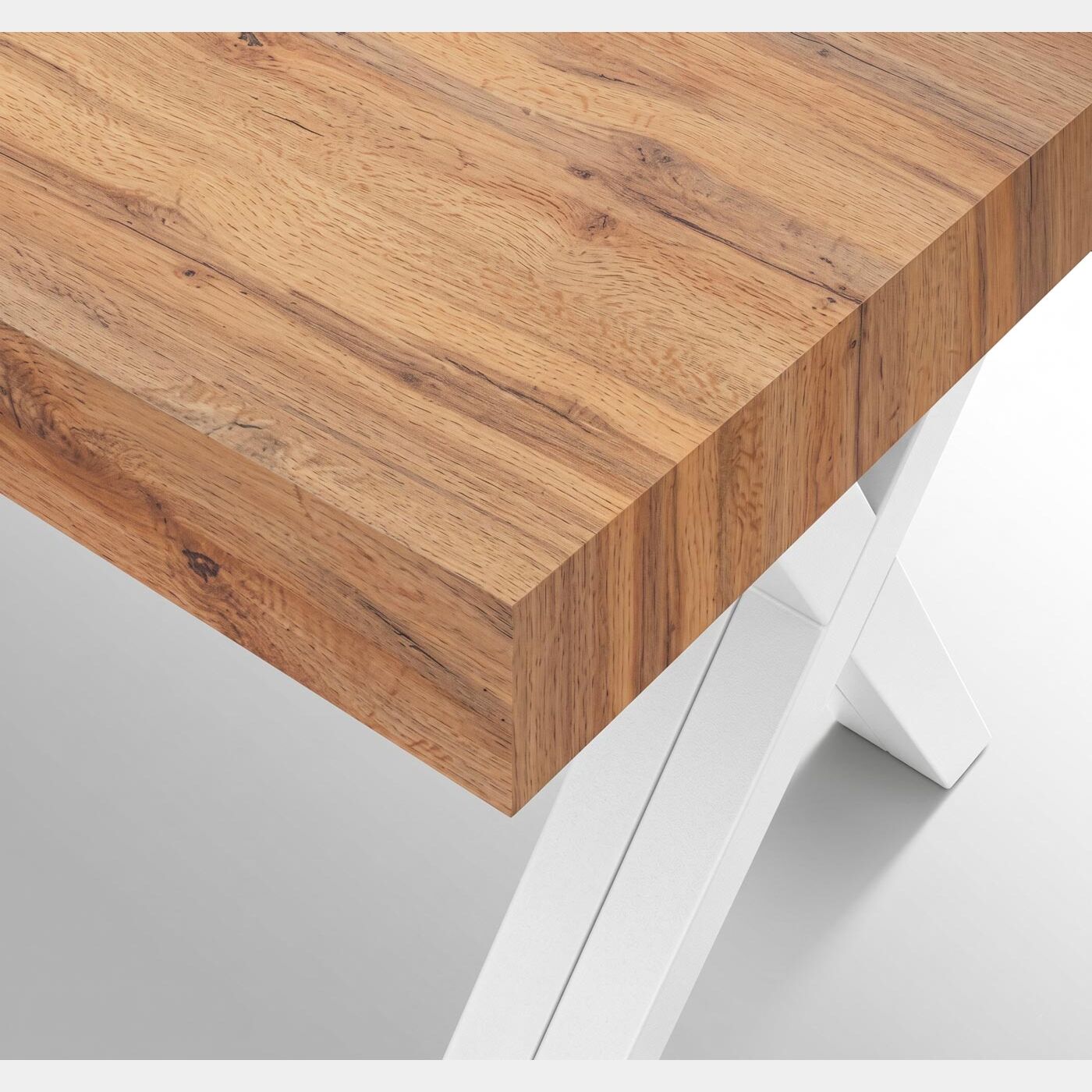 Il contrasto materico è il cuore di questo pezzo: il piano in nobilitato finitura Rovere Rustico regala calore e naturalezza all'ambiente, mostrando venature realistiche e una superficie piacevole al tatto. La struttura è sostenuta da robuste gambe a "X" in MDF rivestito bianco, che donano un tocco moderno, deciso e garantiscono una stabilità impeccabile anche alla massima estensione.
