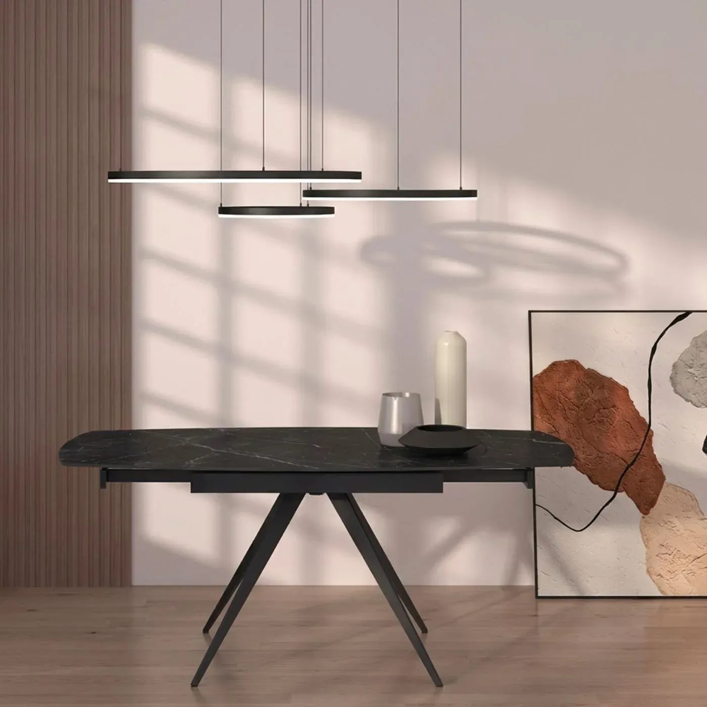 Questo Tavolo moderno ha un piano in ceramica e il top è realizzato in ceramica con una sofisticata finitura Marmo Nero. La superficie presenta venature bianche naturali che contrastano elegantemente con il fondo scuro, offrendo il fascino del marmo con la resistenza tipica della ceramica.