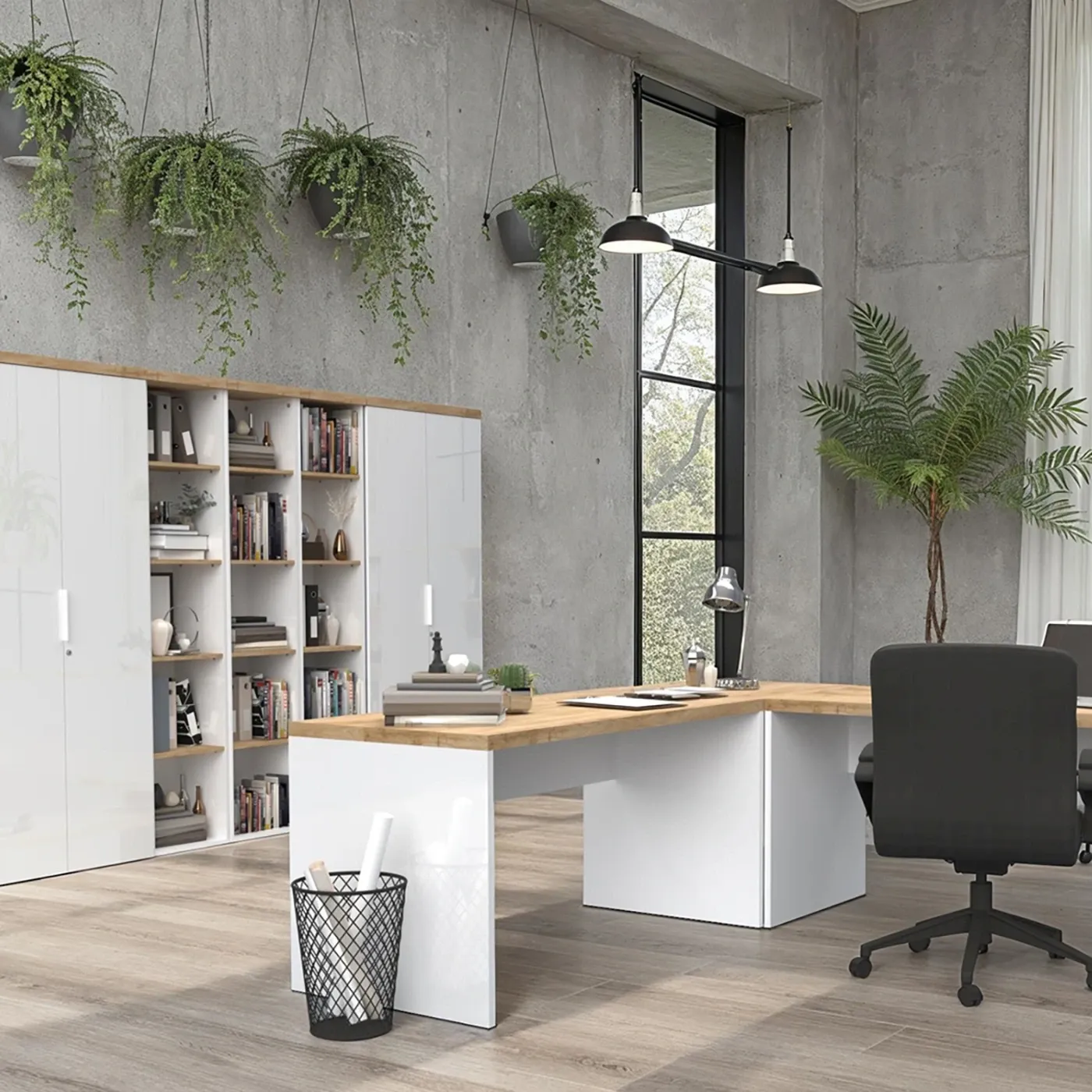 Ufficio completo in finitura Bianco lucido per la struttura dei singoli mobili e Cadiz per il loro top.