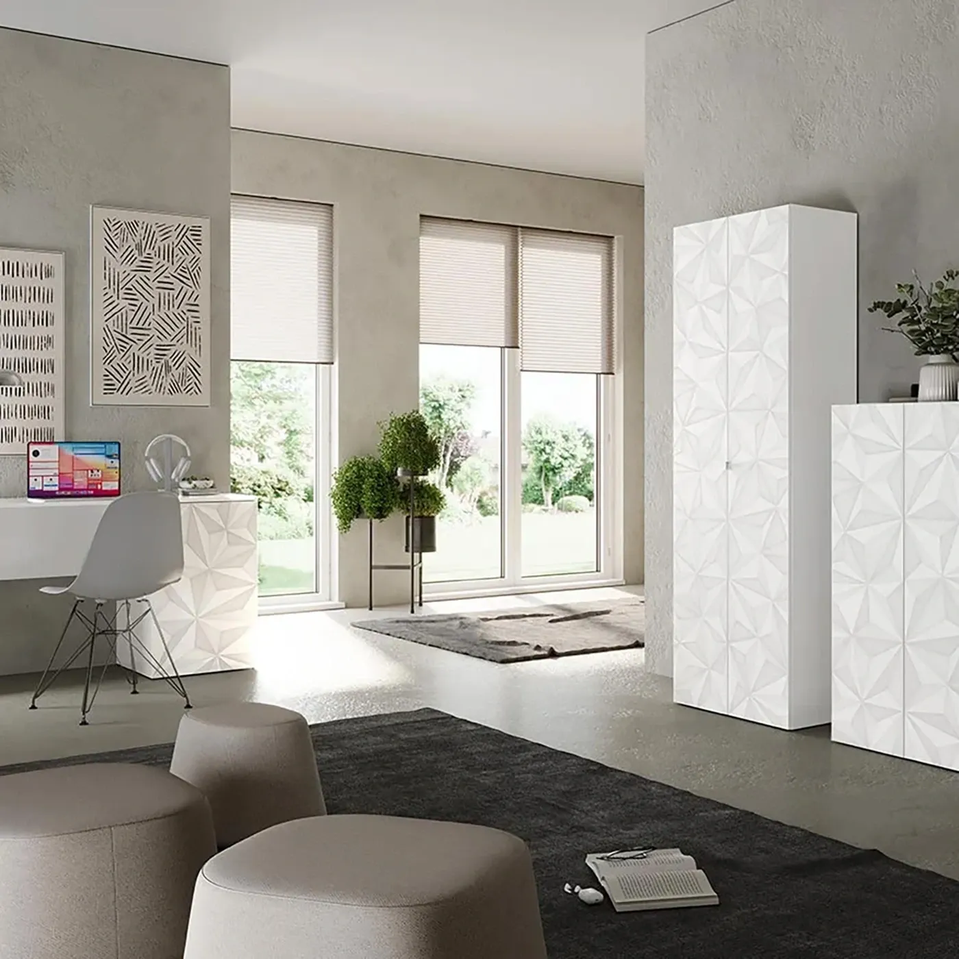 Ufficio completo che si distingue per la finitura in Bianco lucido e per la particolare serigrafia che esibisce lungo le sue superfici.