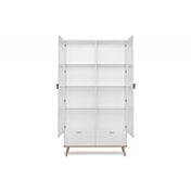 Il suo design ricorda lo stile nordico rendendo il mobile ancor più sobrio e pulito nelle sue linee. Il suo colore rende questa madia estremamente di tendenza, con un design pulito ma accattivante. La sua semplicità conquista tutti. La vetrina è composta da 2 ante vetro apribili grazie alle maniglie in metallo. All'interno la vetrina è divisa in 2 vani da un tramezzo, ogni vano è diviso a sua volta da 3 ripiani in vetro. La vetrina ha inoltre 2 cassetti capienti sotto alle due ante. La struttura ed ante sono bianche, mentre le gambe in legno e la base sono in Quercia.