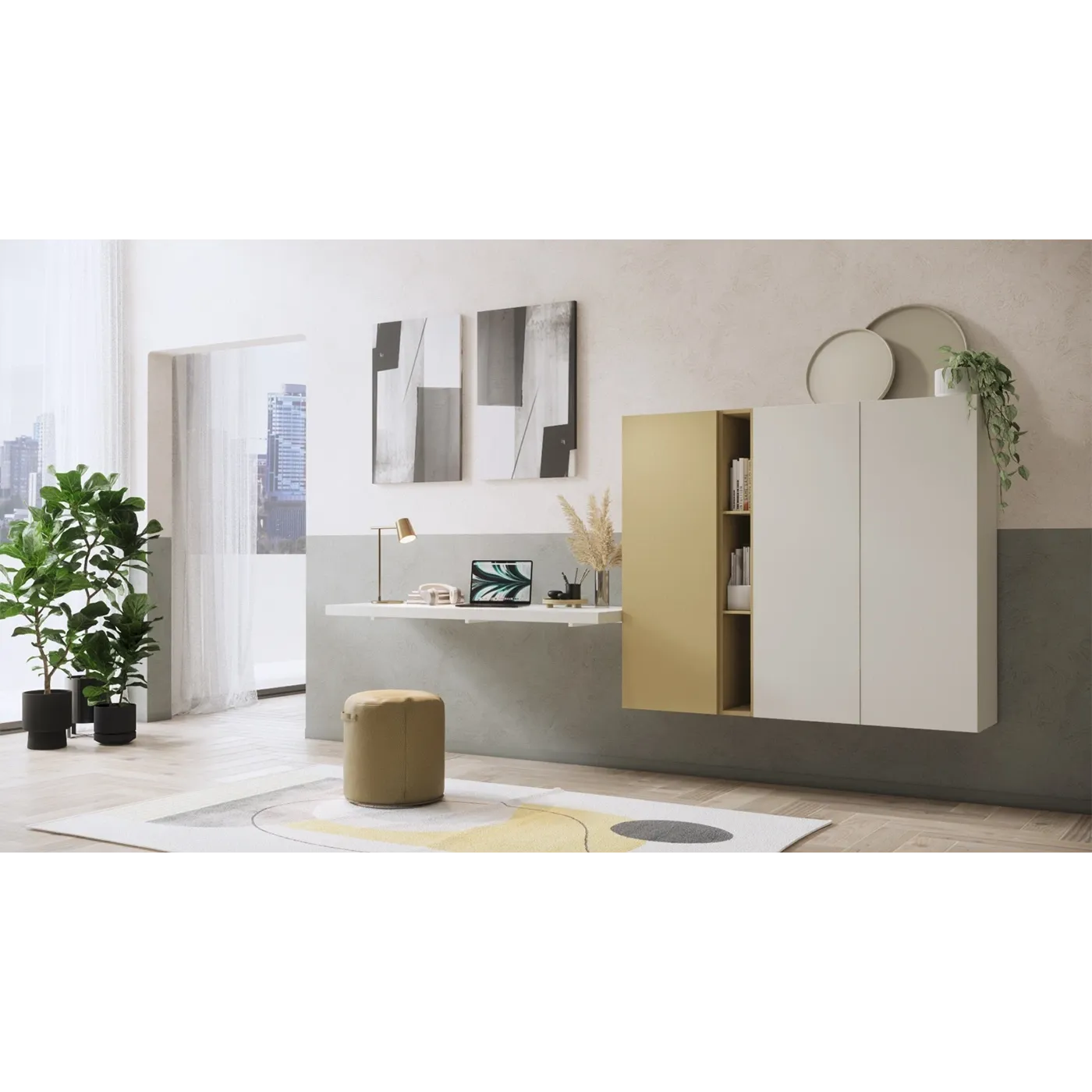 - Un piano sospeso dotato di staffe di fissaggio che funge da scrivania, offrendo così un più che efficiente spazio di lavoro.