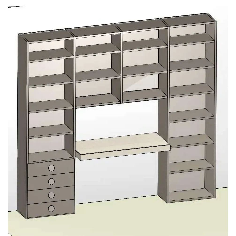 Ai lati e sopra la scrivania c'è libreria modulare a tutta altezza.