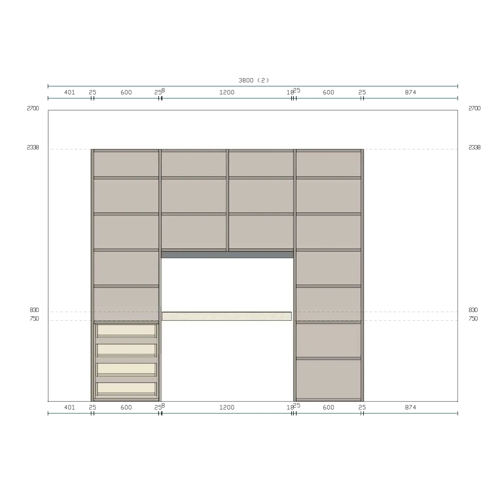 La struttura principale della zona studio, comprese le mensole e la cassettiera, è nel colore visone, una tonalità neutra, elegante e molto attuale.